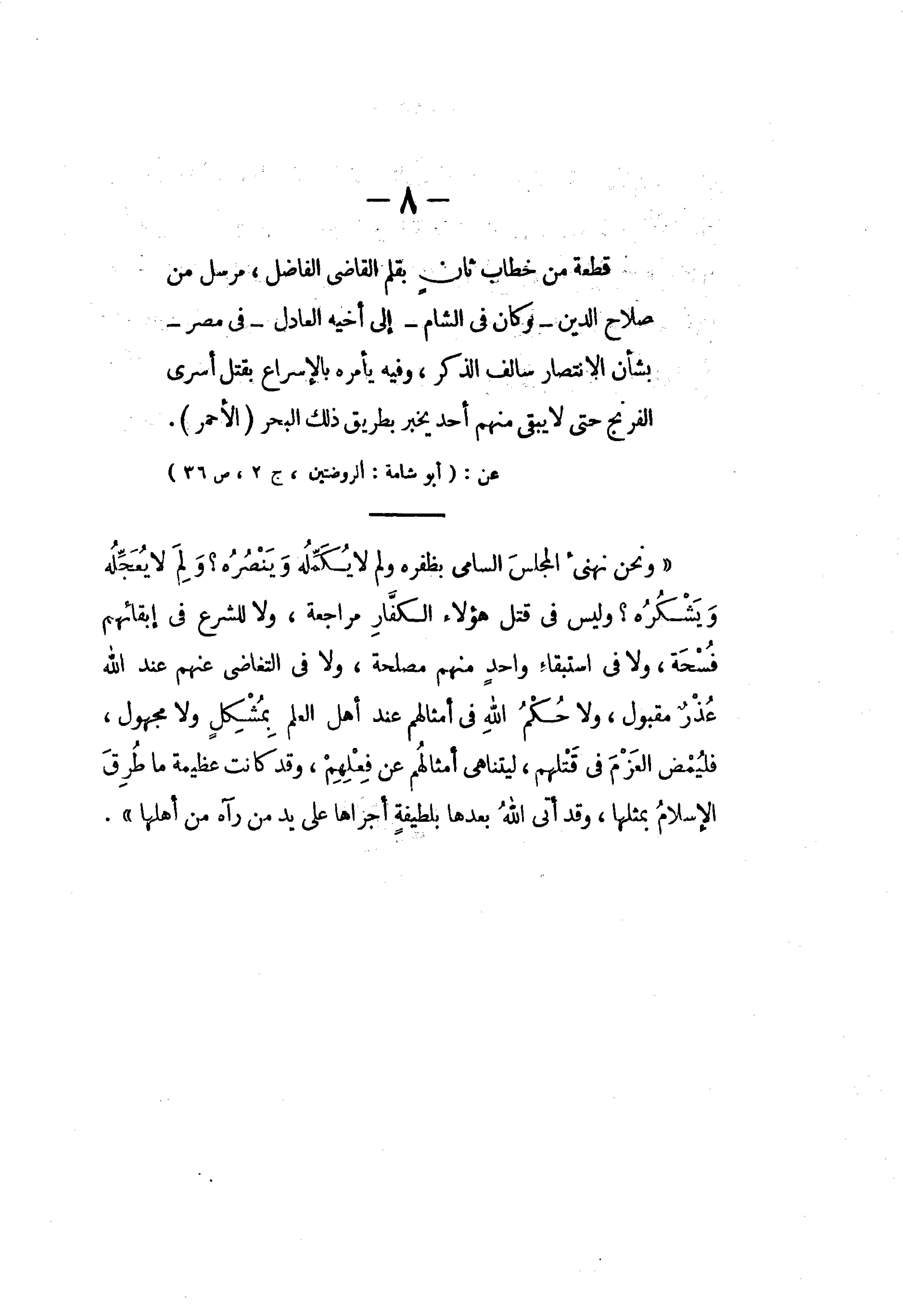 قطعة من خطاب ثان بقلم القاضى الفاضل، مرسل من صلاح الدين - وكان في الشام - إلى أخيه العادل - في مصر - بشأن الانتصار سالف الذكر، وفيه يأمره بالإسراع بقتل أسرى الفرنج حتى لا يبقى منهم أحد يخبر بطريق ذلك البحر (الأحمر)