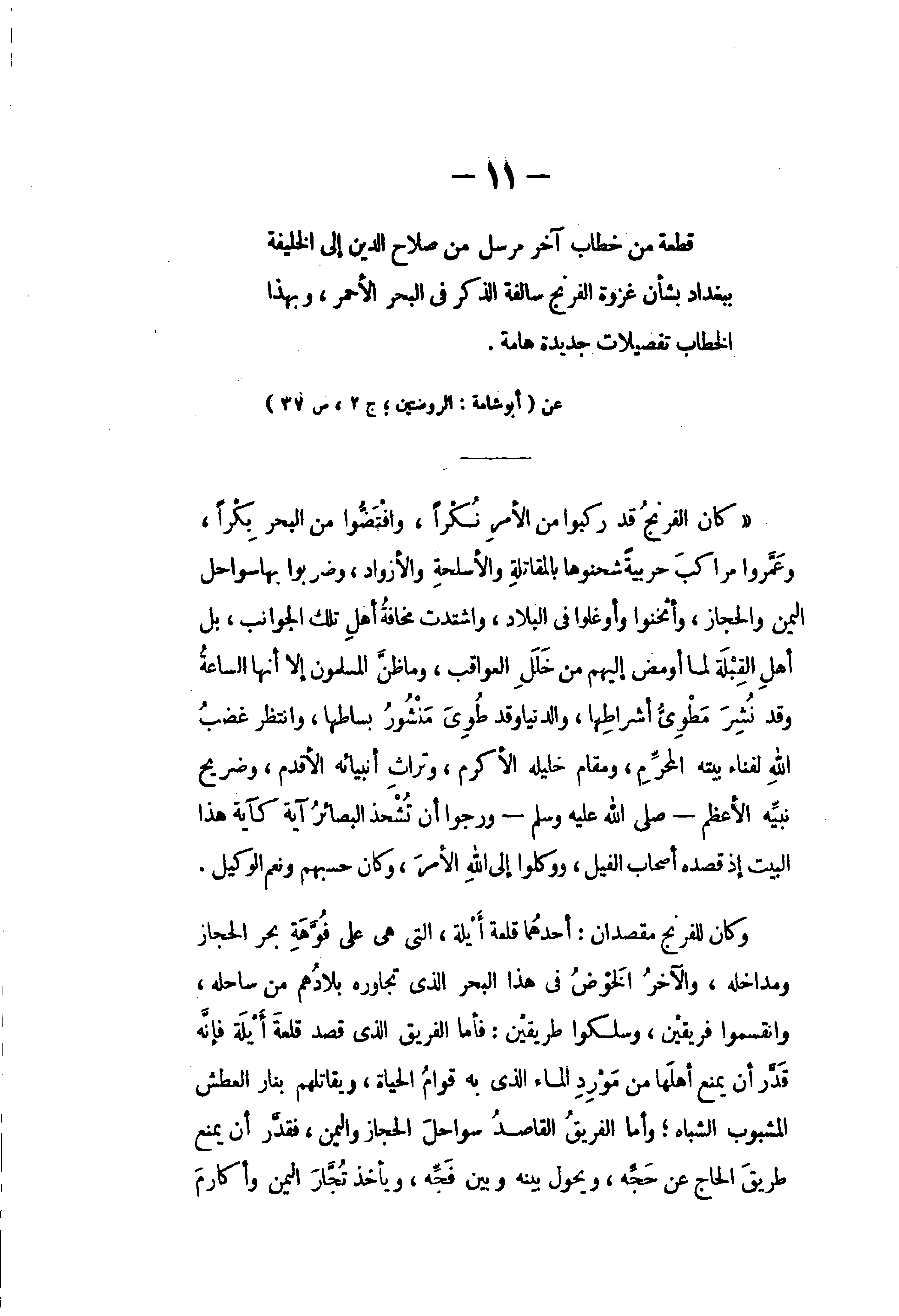 قطعة من خطاب آخر مرسل من صلاح الدين إلى الخليفة ببغداد بشأن غزوة الفرنج سالفة الذكر في البحر الأحمر، وبهذا الخطاب تفصيلات جديدة هامة