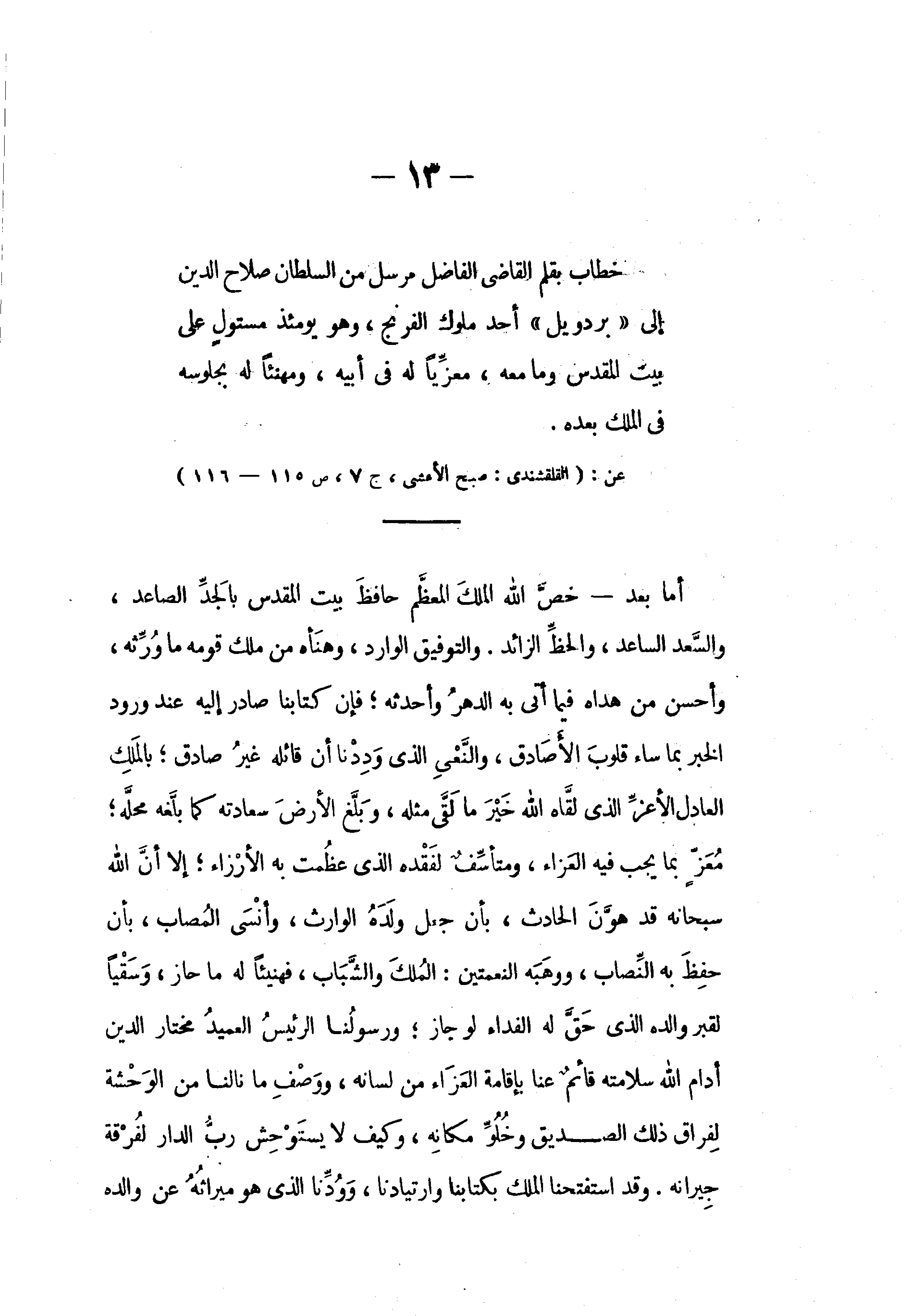 خطاب بقلم القاضى الفاضل مرسل من السلطان صلاح الدين إلى «بردويل» أحد ملوك الفرنج، وهو يومئذ مستول على بيت المقدس وما معه، معزّيا له في أبيه، ومهنئا له بجلوسه في الملك بعده