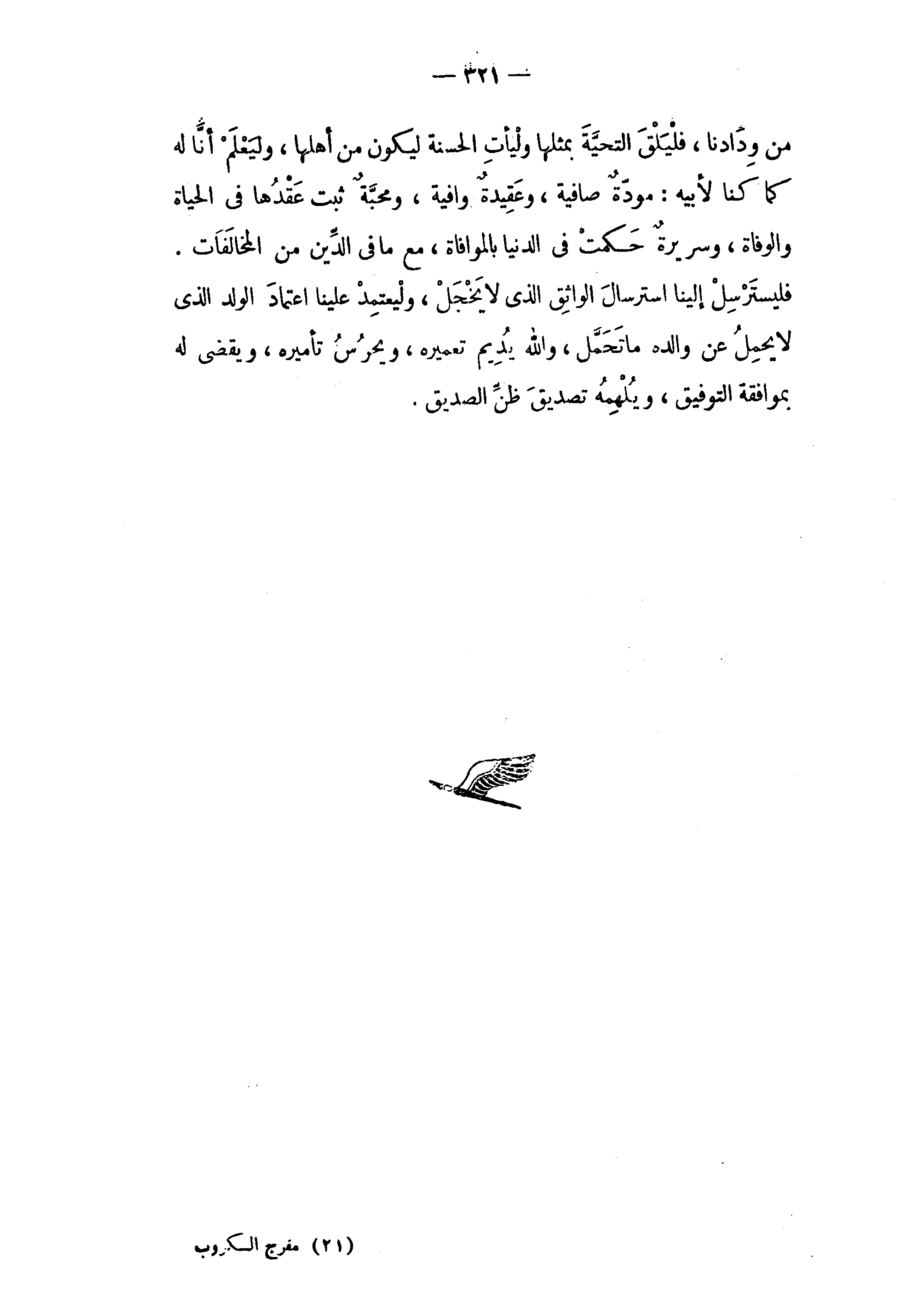 من ودادنا، فليلق التحيّة بمثلها وليأت الحسنة ليكون من أهلها، وليعلم أنّا له كما كنا لأبيه: مودّة صافية، وعقيدة وافية، ومحبّة ثبت عقدها في الحياة والوفاة، وسريرة حكمت في الدنيا بالموافاة، مع ما في الدّين من المخالفات.