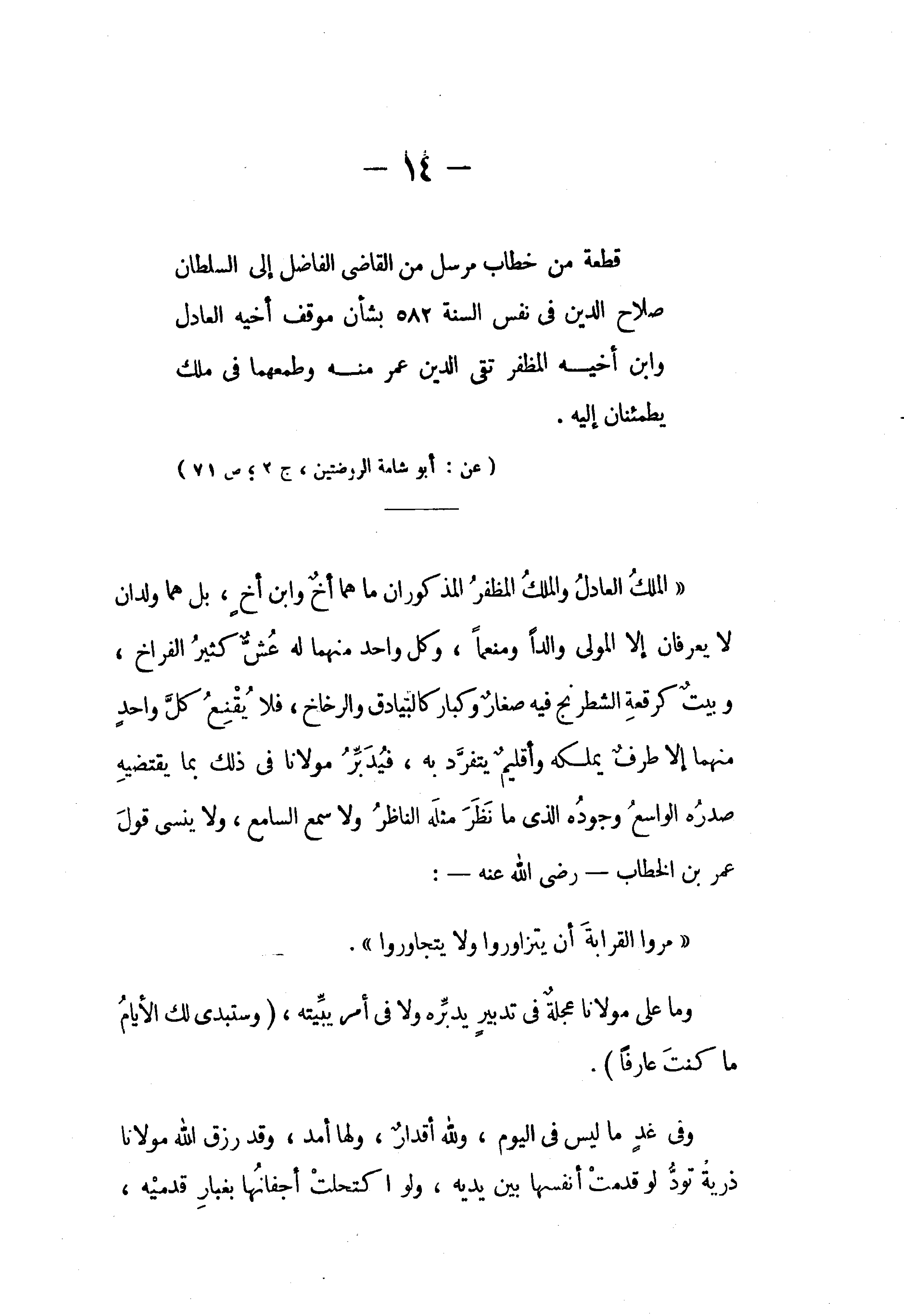 قطعة من خطاب مرسل من القاضى الفاضل إلى السلطان صلاح الدين في نفس السنة 582 بشأن موقف أخيه العادل وابن أخيه المظفر تقى الدين عمر منه وطمعهما في ملك يطمئنان إليه
