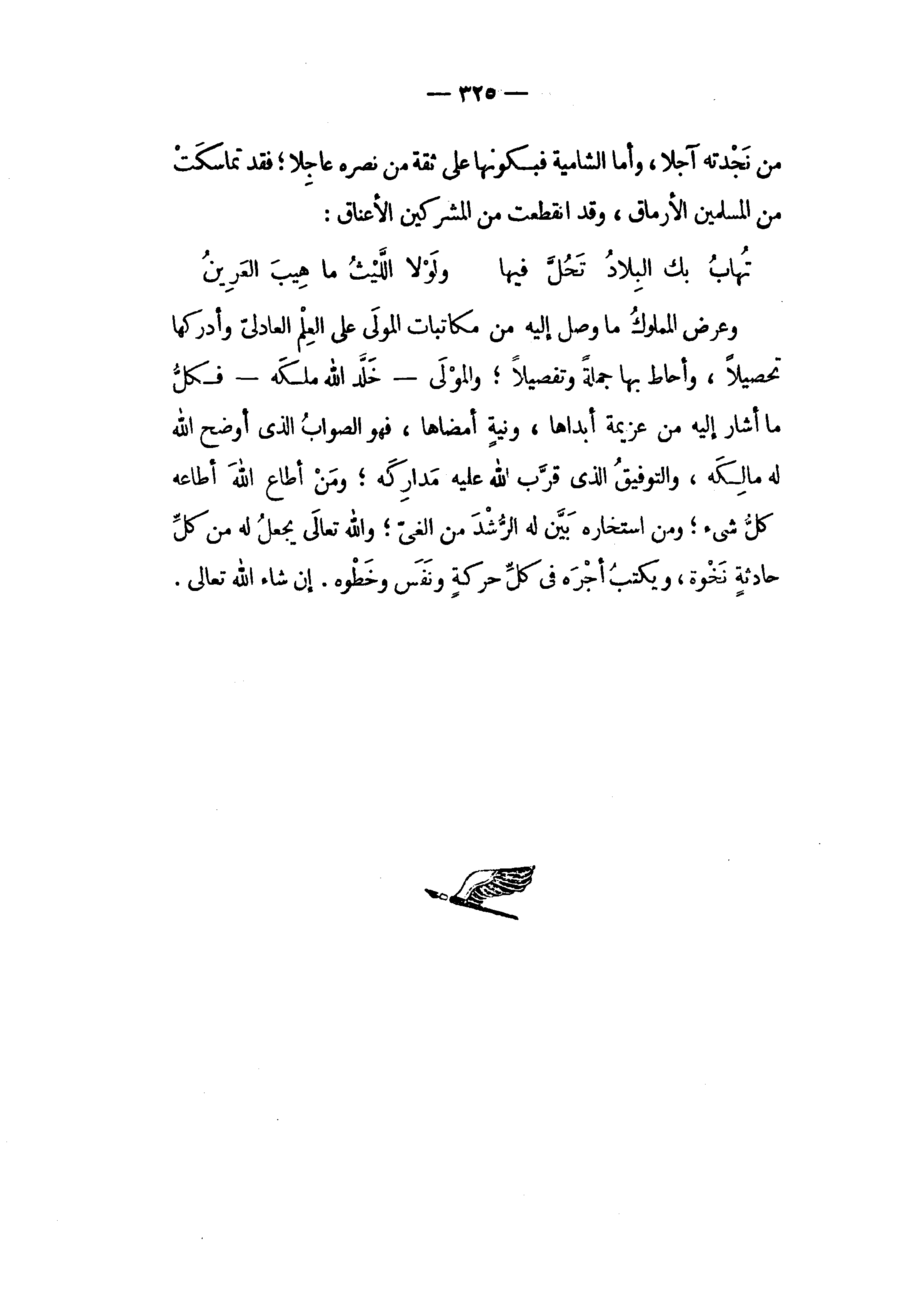 وعرض المملوك ما وصل إليه من مكاتبات المولى على العلم العادلىّ وأدركها تحصيلا، وأحاط بها جملة وتفصيلا؛ والمولى - خلّد الله ملكه - فكلّ ما أشار إليه من عزيمة أبداها، ونية أمضاها، فهو الصواب الذى أوضح الله له مالكه، والتوفيق الذى قرّب الله عليه مداركه؛ ومن أطاع الله أطاعه كلّ شىء؛ ومن استخاره بيّن له الرّشد من الغىّ؛ والله تعالى يجعل له من كلّ حادثة نخوة، ويكتب أجره في كلّ حركة ونفس وخطوه. إن شاء الله تعالى.