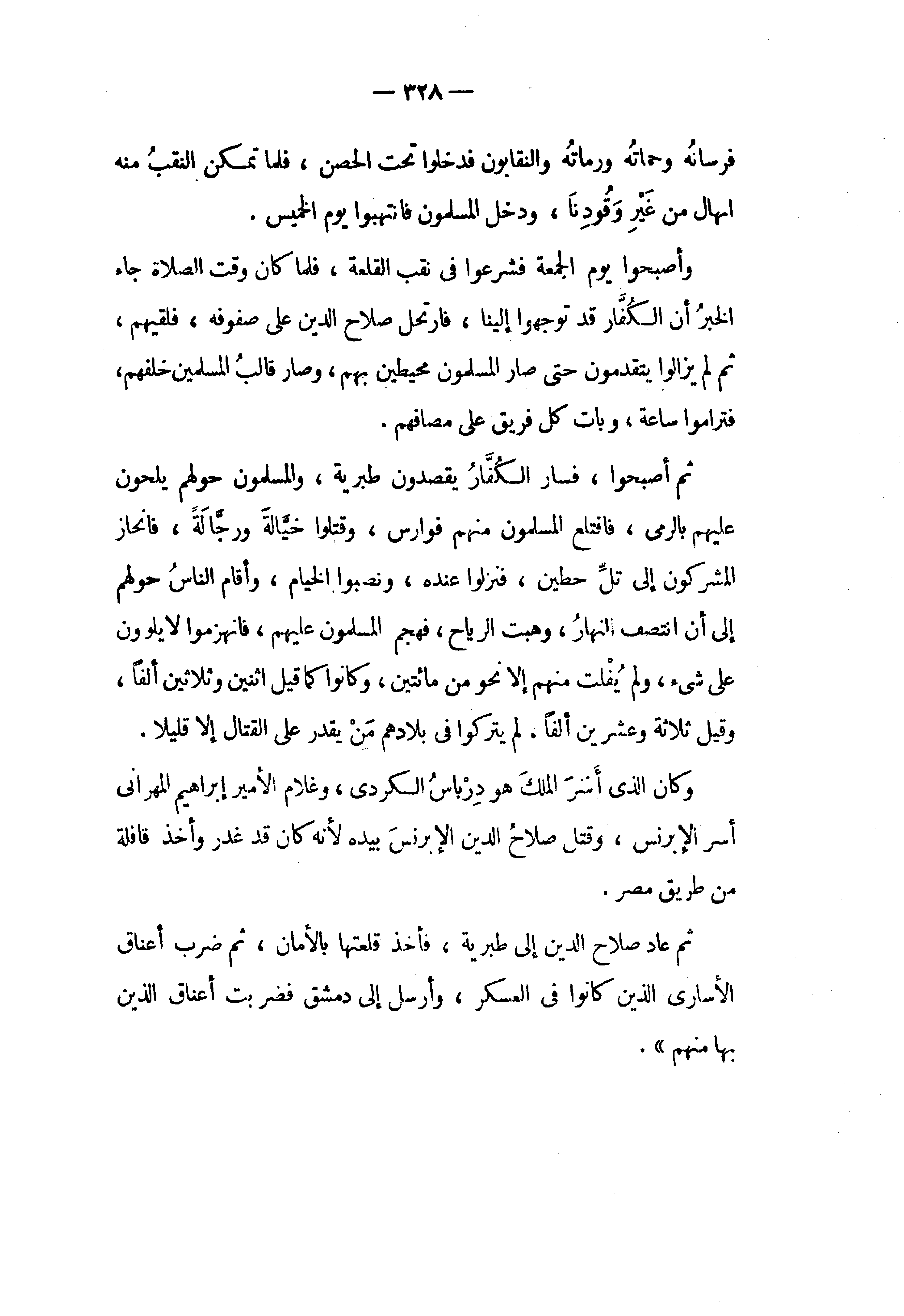 ثم أصبحوا، فسار الكفّار يقصدون طبرية، والمسلمون حولهم يلحون عليهم بالرمى، فاقتلع المسلمون منهم فوارس، وقتلوا خيّالة ورجّالة، فانحاز المشركون إلى تلّ حطين، فنزلوا عنده، ونصبوا الخيام، وأقام الناس حولهم إلى أن انتصف النهار، وهبت الرياح، فهجم المسلمون عليهم، فانهزموا لا يلوون على شيء، ولم يفلت منهم إلا نحو من مائتين، وكانوا كما قيل اثنين وثلاثين ألفا، وقيل ثلاثة وعشرين ألفا، لم يتركوا في بلادهم من يقدر على القتال إلا قليلا.