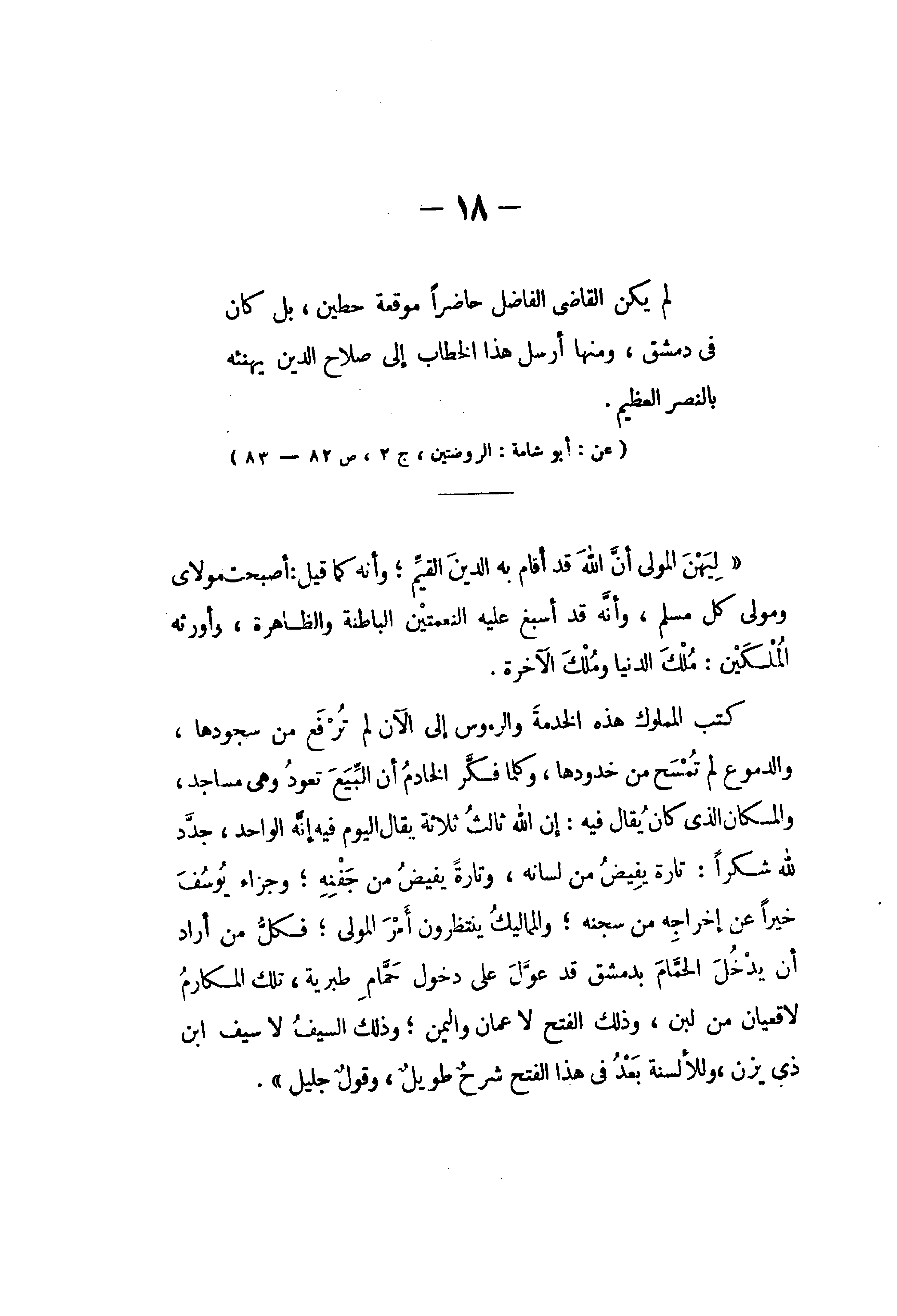كتب المملوك هذه الخدمة والرءوس إلى الآن لم ترفع من سجودها، والدموع لم تمسح من خدودها، وكلما فكّر الخادم أن البّيع تعود وهى مساجد، والمكان الذى كان يقال فيه: إن الله ثالث ثلاثة يقال اليوم فيه إنّه الواحد، جدّد لله شكرا: تارة يفيض من لسانه، وتارة يفيض من جفنه؛ وجزاء يوسف خيرا عن إخراجه من سجنه؛ والمماليك ينتظرون أمر المولى؛ فكلّ من أراد أن يدخل الحمّام بدمشق قد عوّل على دخول حمّام طبرية، تلك المكارم لاقعيان من لبن، وذلك الفتح لا عمان واليمن؛ وذلك السيف لا سيف ابن ذى يزن، وللألسنة بعد في هذا الفتح شرح طويل، وقول جليل».