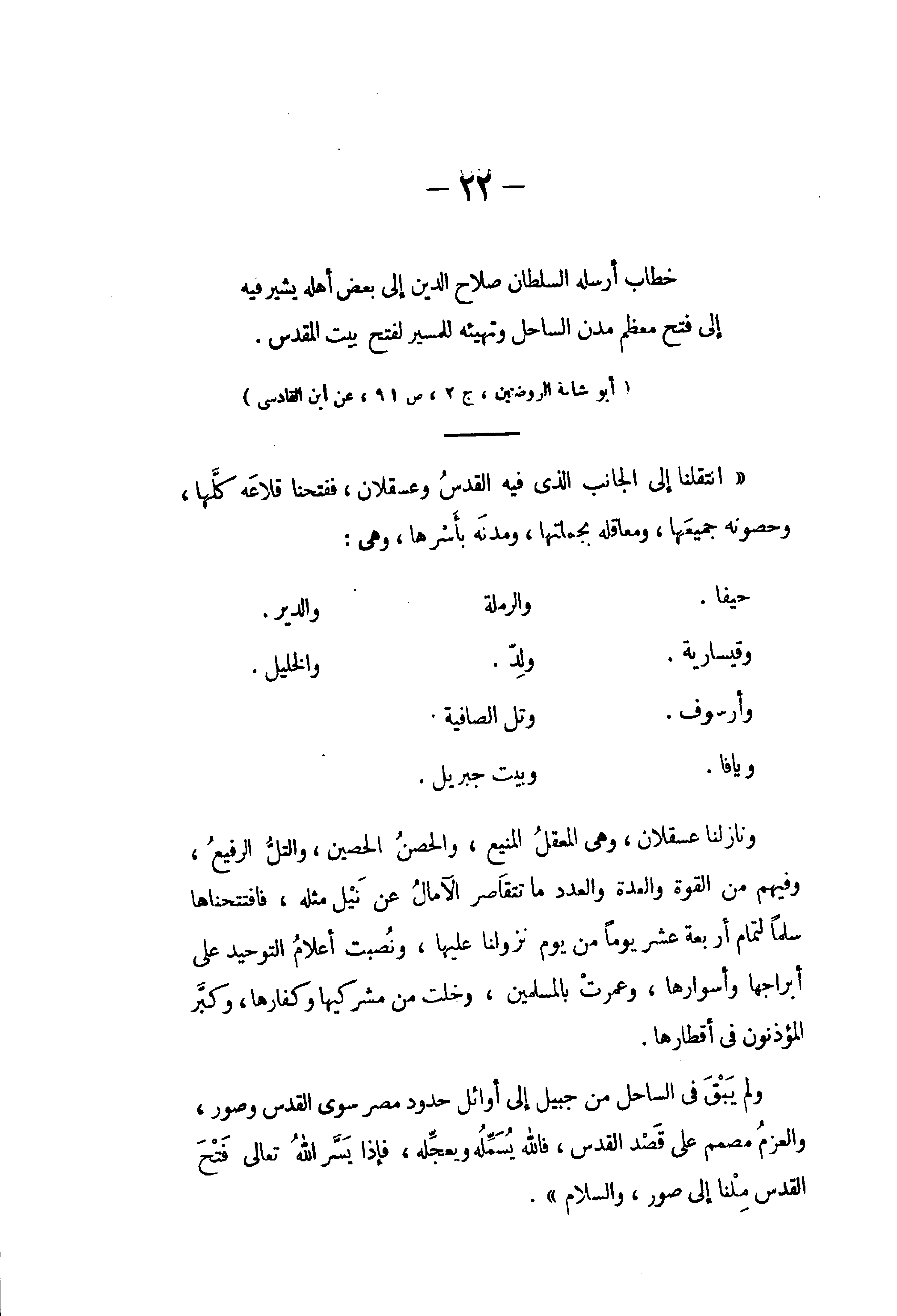 «انتقلنا إلى الجانب الذى فيه القدس وعسقلان، ففتحنا قلاعه كلّها، وحصونه جميعها، ومعاقله بجملتها، ومدنه بأسرها، وهى: