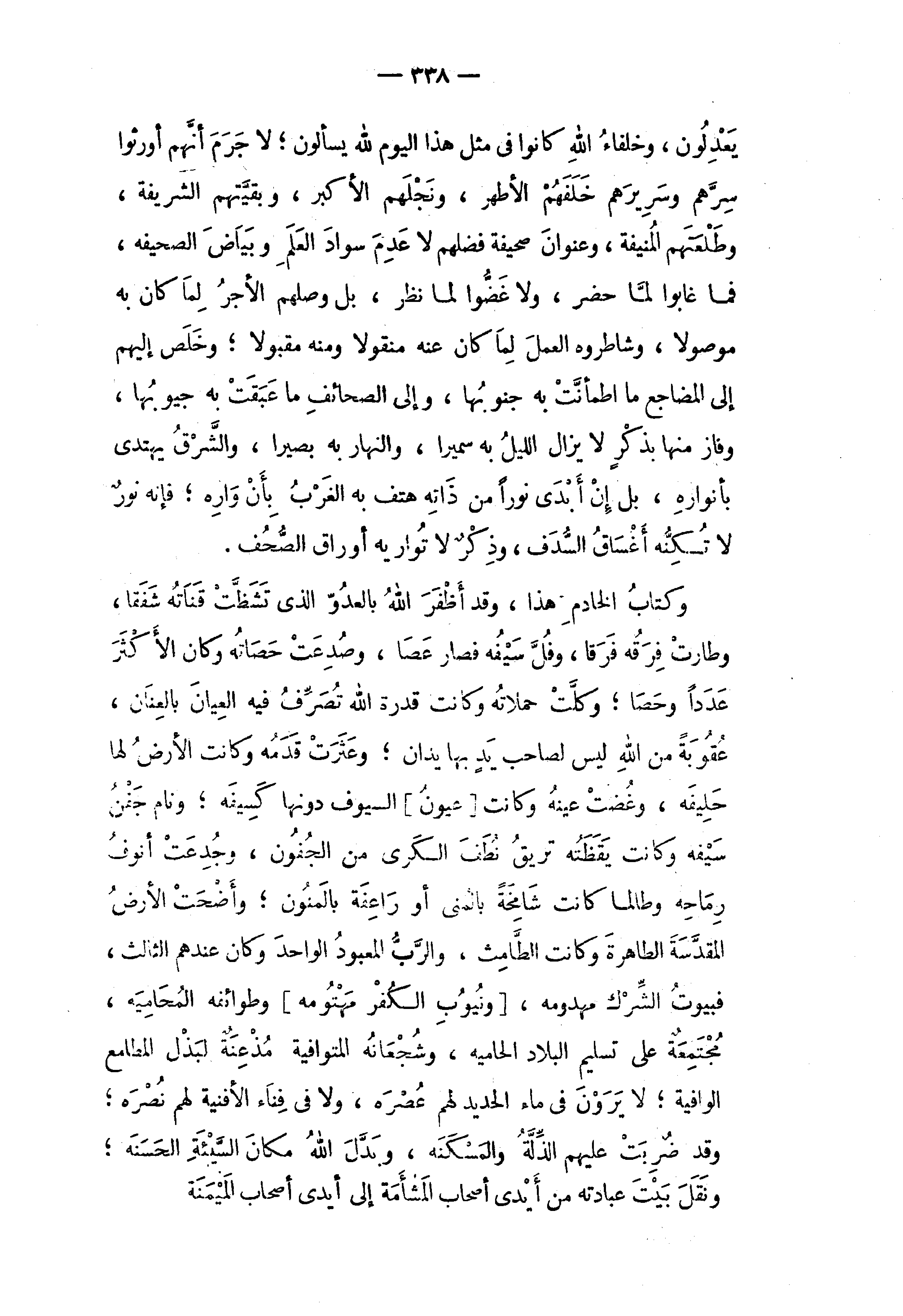 يعدلون، وخلفاء الله كانوا في مثل هذا اليوم لله يسألون؛ لا جرم أنّهم أورثوا سرّهم وسريرهم خلفهم الأطهر، ونجلهم الأكبر، وبقيّتهم الشريفة، وطلعتهم المنيفة، وعنوان صحيفة فضلهم لا عدم سواد العلم وبياض الصحيفه، فما غابوا لمّا حضر، ولا غضّوا لما نظر، بل وصلهم الأجر لما كان به موصولا، وشاطروه العمل لما كان عنه منقولا ومنه مقبولا؛ وخلص إليهم إلى المضاجع ما اطمأنّت به جنوبها، وإلى الصحائف ما عبقت به جيوبها، وفاز منها بذكر لا يزال الليل به سميرا، والنهار به بصيرا، والشّرق يهتدى بأنواره، بل إن أبدى نورا من ذاته هتف به الغرب بأن واره؛ فإنه نور لا تكنّه أغساق السّدف، وذكر لا تواريه أوراق الصّحف.
