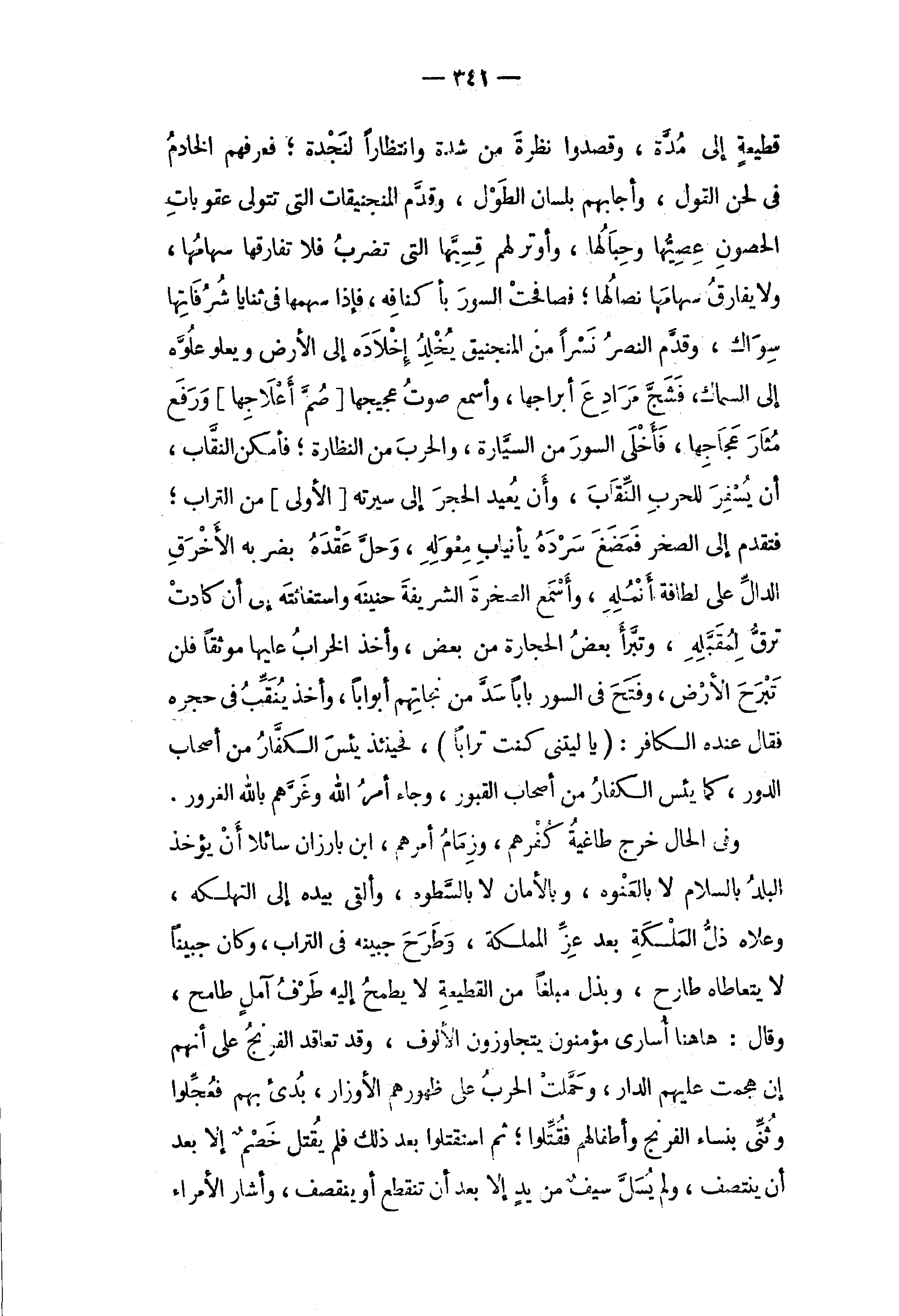 قطيعة إلى مدّة، وقصدوا نظرة من شدة وانتظارا لنجدة؛ فعرفهم الخادم في لحن القول، وأجابهم بلسان الطول، وقدّم المنجنيقات التي تتولى عقوبات الحصون عصيّها وحبالها، وأوتر لهم قسيّها التي تضرب فلا تفارقها سهامها، ولا يفارق سهامها نصالها؛ فصافحت السور بأكنافه، فإذا سهمها في ثنايا شرفاتها سواك، وقدّم النصر نشرا من المنجنيق يخلد إخلاده إلى الأرض ويعلو علوّه إلى السماك، فشجّ مرادع أبراجها، وأسمع صوت عجيجها [صمّ أعلاجها] ورفع مثار عجاجها، فأخلى السور من السيّارة، والحرب من النظارة؛ فأمكن النقّاب، أن يسفر للحرب النّقاب، وأن يعيد الحجر إلى سيرته [الأولى] من التراب؛ فتقدم إلى الصخر فمضغ سرده يأنياب معوله، وحلّ عقده بضربه الأخرق الدالّ على لطافة أنمله، وأسمع الصخرة الشريفة حنينه واستغاثته إلى أن كادت ترقّ لمقبّله، وتبرّأ بعض الحجارة من بعض، وأخذ الخراب عليها موثقا فلن تبرح الأرض، وفتح في السور بابا سدّ من نجاتهم أبوابا، وأخذ ينقّب في حجره فقال عنده الكافر: {يا لَيْتَنِي كُنْتُ تُراباً،} فحينئذ يئس الكفّار من أصحاب الدور، كما يئس الكفار من أصحاب القبور، وجاء أمر الله وغرّهم بالله الغرور.