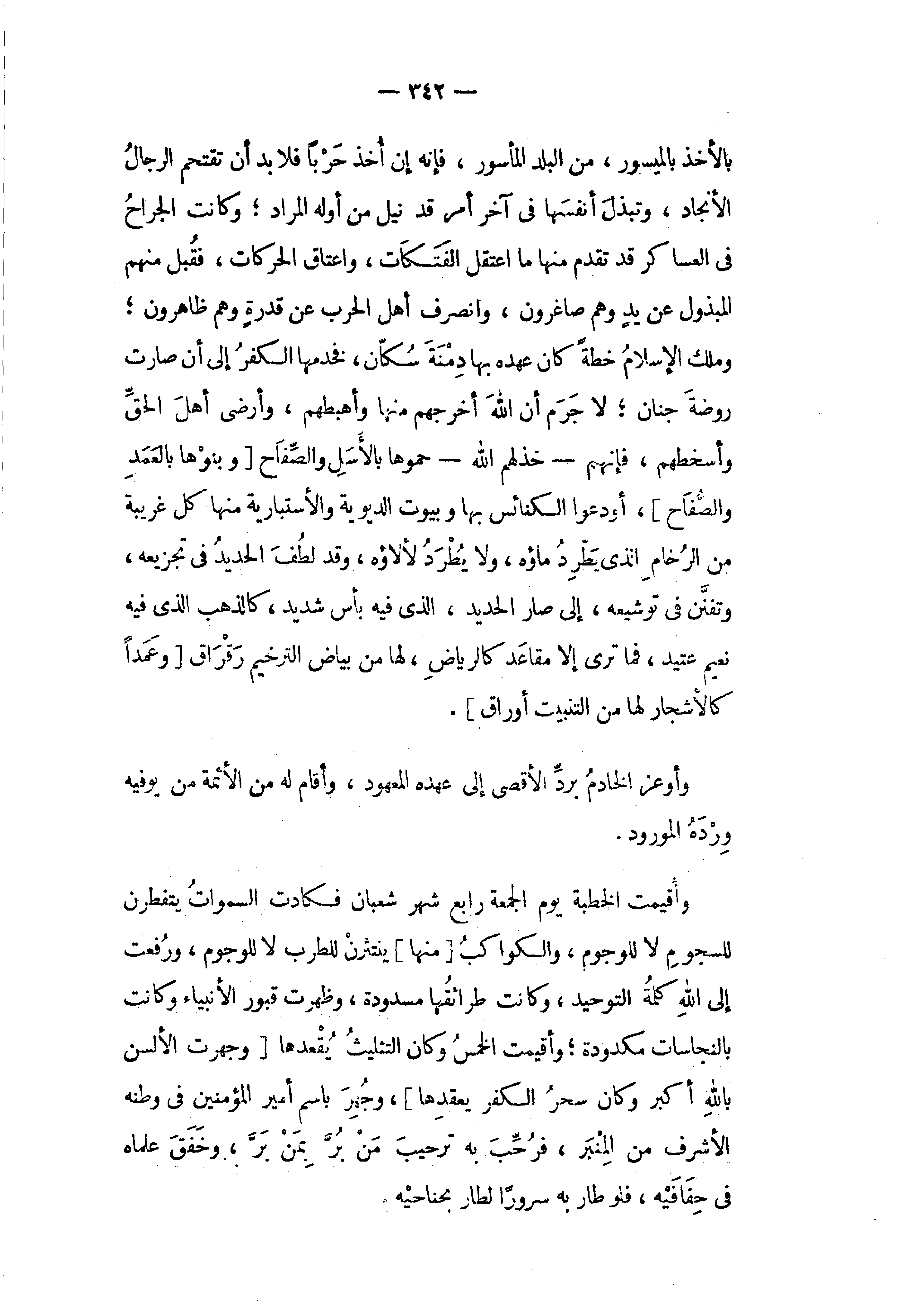 وأقيمت الخطبة يوم الجمعة رابع شهر شعبان فكادت السموات يتفطرن للسجوم لا للوجوم، والكواكب [منها] ينتثرن للطرب لا للوجوم، ورفعت إلى الله كلمة التوحيد، وكانت طرائقها مسدودة، وظهرت قبور الأنبياء وكانت بالنجاسات مكدودة؛ وأقيمت الخمس وكان التثليث يقعدها [وجهرت الألسن بالله أكبر وكان سحر الكفر يعقدها]، وجهر باسم أمير المؤمنين في وطنه الأشرف من المنبر، فرحّب به ترحيب من برّ بمن برّ، وخفق علماه في حفافيه، فلو طار به سرورا لطار بجناحيه.