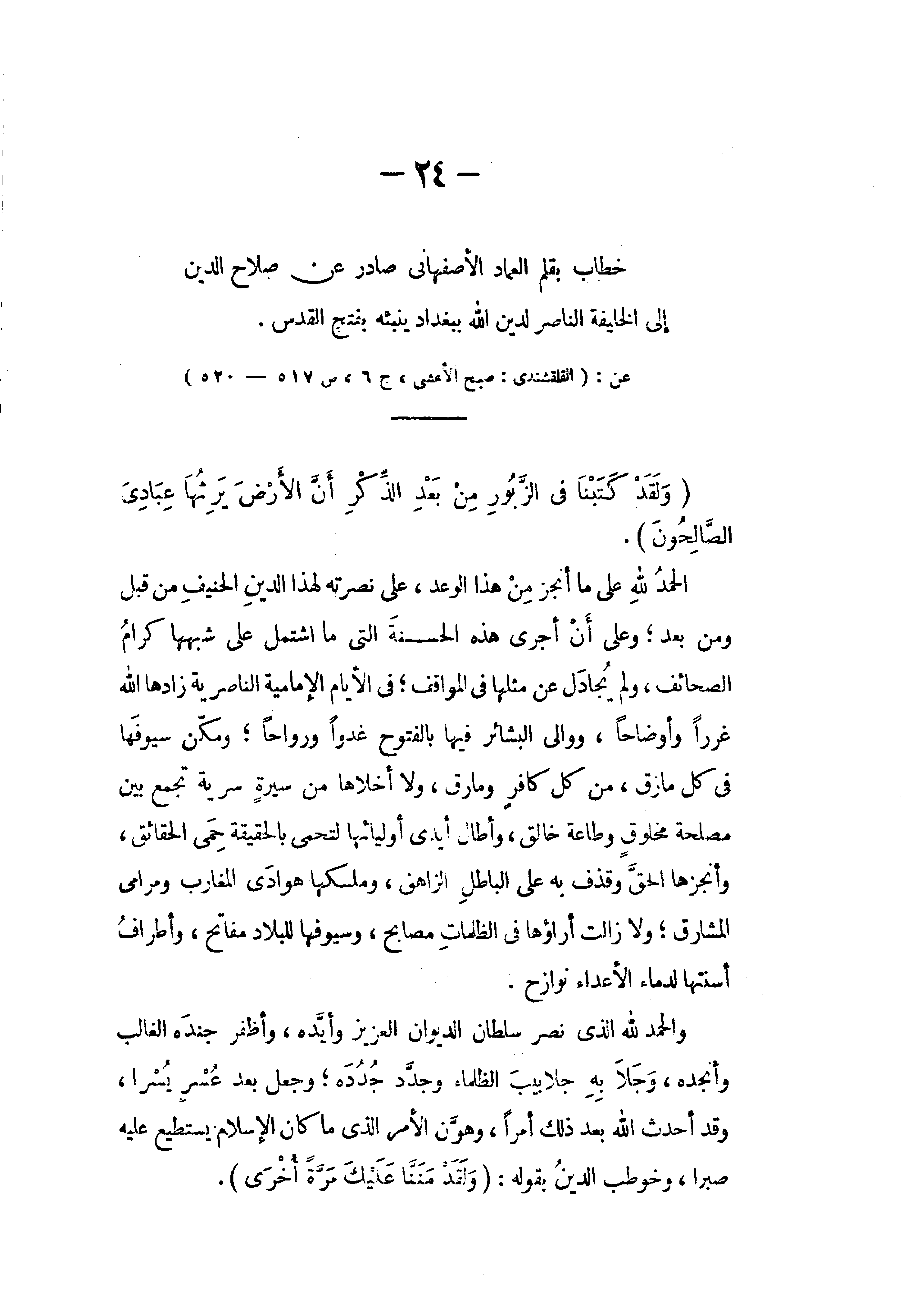 خطاب بقلم العماد الأصفهانى صادر عن صلاح الدين إلى الخليفة الناصر لدين الله ببغداد ينبئه بفتح القدس