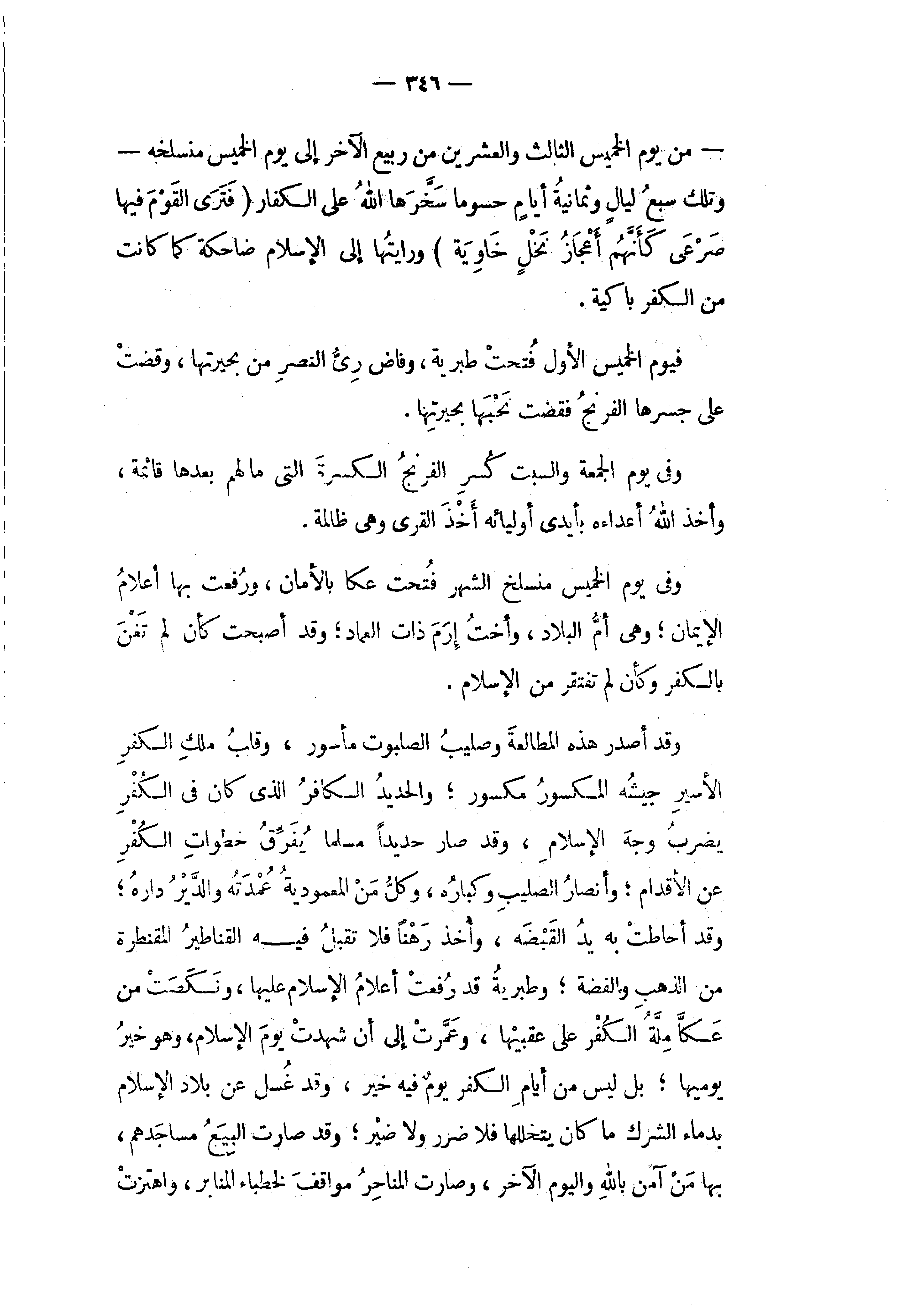 وقد أصدر هذه المطالعة وصليب الصلبوت مأسور، وقلب ملك الكفر الأسير جيشه المكسور مكسور؛ والحديد الكافر الذى كان في الكفر يضرب وجه الإسلام، وقد صار حديدا مسلما يفرّق خطوات الكفر عن الأقدام؛ وأنصار الصليب وكباره، وكلّ من المعمودية عمدته والدّير داره؛ وقد أحاطت به يد القبضه، وأخذ رهنا فلا تقبل فيه القناطير المقنطرة من الذهب والفضة؛ وطبرية قد رفعت أعلام الإسلام عليها، ونكصت من عكّا ملّة الكفر على عقبيها، وعمّرت إلى أن شهدت يوم الإسلام، وهو خير يوميها؛ بل ليس من أيام الكفر يوم فيه خير، وقد غسل عن بلاد الإسلام بدماء الشرك ما كان يتخللها فلا ضرر ولا ضيّر؛ وقد صارت البيع مساجدهم، بها من آمن بالله واليوم الآخر، وصارت المناحر مواقف لخطباء المنابر، واهتزت