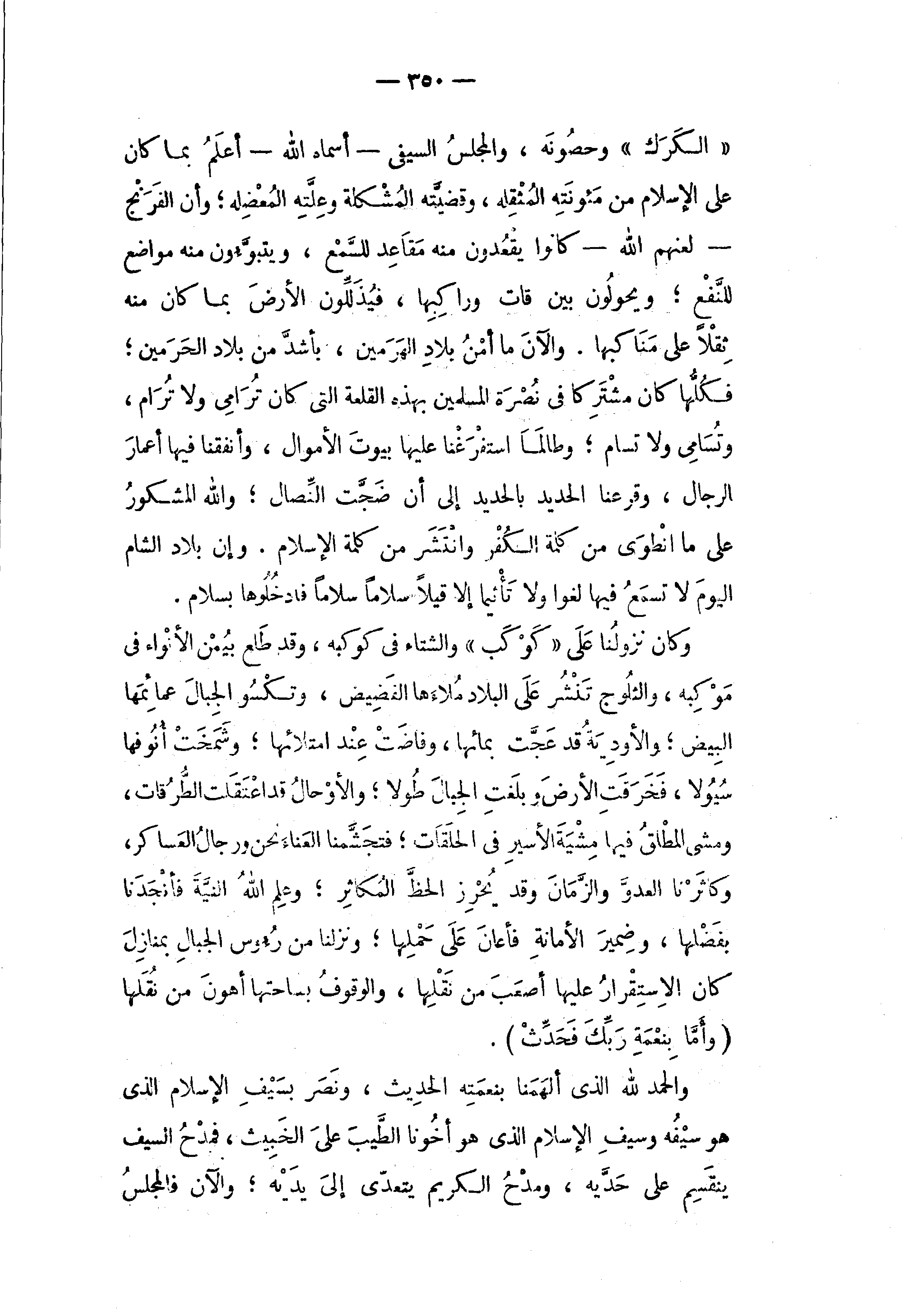 «الكرك» وحصونه، والمجلس السيفى - أسماه الله - أعلم بما كان على الإسلام من مئونته المثقله، وقضيّته المشكلة وعلّته المعضله؛ وأن الفرنج - لعنهم الله - كانوا يقعدون منه مقاعد للسّمع، ويتبوّءون منه مواضع للنّفع؛ ويحولون بين قات وراكبها، فيذللّون الأرض بما كان منه ثقلا على مناكبها. والآن ما أمن بلاد الهرمين، بأشدّ من بلاد الحرمين؛ فكلّها كان مشتركا في نصرة المسلمين بهذه القلعة التي كان ترامى ولا ترام، وتسامى ولا تسام؛ وطالما استفرغنا عليها بيوت الأموال، وأنفقنا فيها أعمار الرجال، وقرعنا الحديد بالحديد إلى أن ضجّت النّصال؛ والله المشكور على ما انطوى من كلمة الكفر وانتشر من كلمة الإسلام. وإن بلاد الشام اليوم لا تسمع فيها لغوا ولا تأثيما إلا قيلا سلاما سلاما فادخلوها بسلام.
