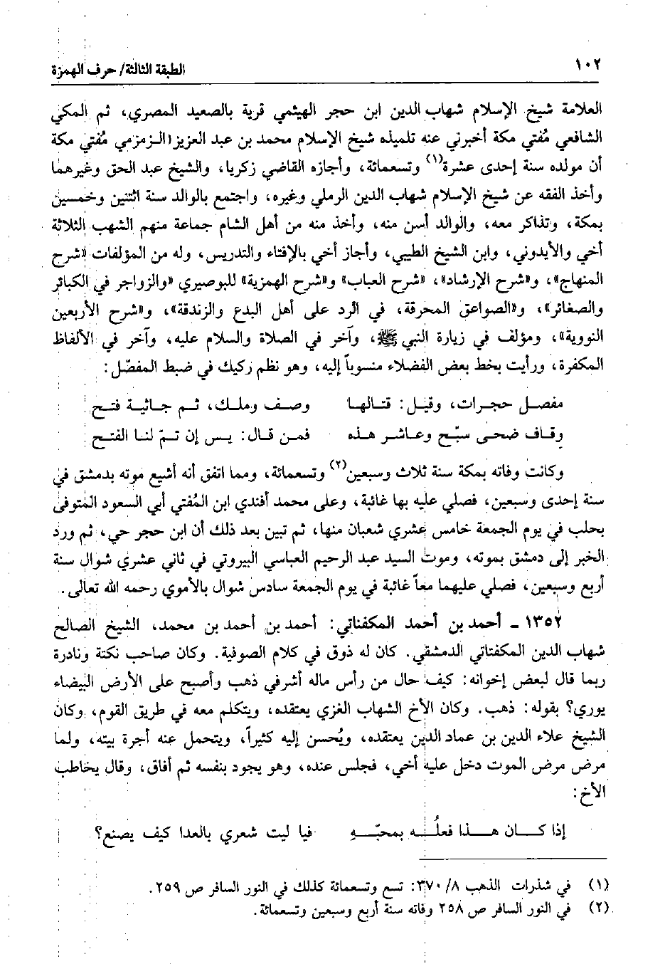 العلامة شيخ الإسلام شهاب الدين ابن حجر الهيثمي قرية بالصعيد المصري، ثم المكي الشافعي مفتي مكة أخبرني عنه تلميذه شيخ الإسلام محمد بن عبد العزيز الزمزمي مفتي مكة أن مولده سنة إحدى عشرة وتسعمائة، وأجازه القاضي زكريا، والشيخ عبد الحق وغيرهما وأخذ الفقه عن شيخ الإسلام شهاب الدين الرملي وغيره، واجتمع بالوالد سنة اثتنين وخمسين بمكة، وتذاكر معه، والوالد أسن منه، وأخذ منه من أهل الشام جماعة منهم الشهب الثلاثة أخي والأيدوني، وابن الشيخ الطيبي، وأجاز أخي بالإفتاء والتدريس وله من المؤلفات شرح المنهاج، وشرح الإرشاد، شرح العباب وشرح الهمزية للبوصيري والزواجر في الكبائر والصغائر، والصواعق المحرقة، في الرد على أهل البدع والزندقة، وشرح الأربعين النووية،، ومؤلف في زيارة النبي صلى الله عليه وسلم، وآخر في الصلاة والسلام عليه، وآخر في الألفاظ المكفرة، ورأيت بخط بعض الفضلاء منسوباً إليه، وهو نظم ركيك في ضبط المفصّ