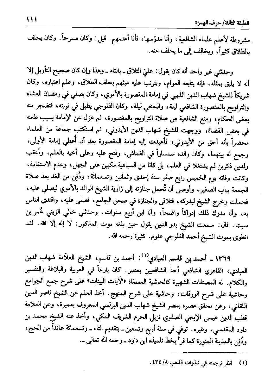 أحمد بن قاسم، الشيخ العلامة شهاب الدين العبادي، القاهري الشافعي أحد الشافعيين بمصر. كان بارعاً في العربية والبلاغة والتفسير والكلام. له المصنفات الشهيرة كالحاشية المسماة الآيات البينات، على شرح جمع الجوامع وحاشية على شرح الورقات، وحاشية على شرح المنهج. أخذ العلم عن الشيخ ناصر الدين اللقاني، وعن محقق عصره بمصر الشيخ شهاب الدين البرلسي المعروف بعميرة، وعن العلامة قطب الدين عيسى الإيجي الصفوي نزيل الحرم الشريف المكي، وأخذ عنه الشيخ محمد بن داود المقدسي، وغيره. توفي في سنة أربع وتسعين بتقديم التاء وتسعمائة عائداً من الحج ودفن بالمدينة المنورة كما قرأ بخط تلميذه ابن داود رحمه الله تعالى.