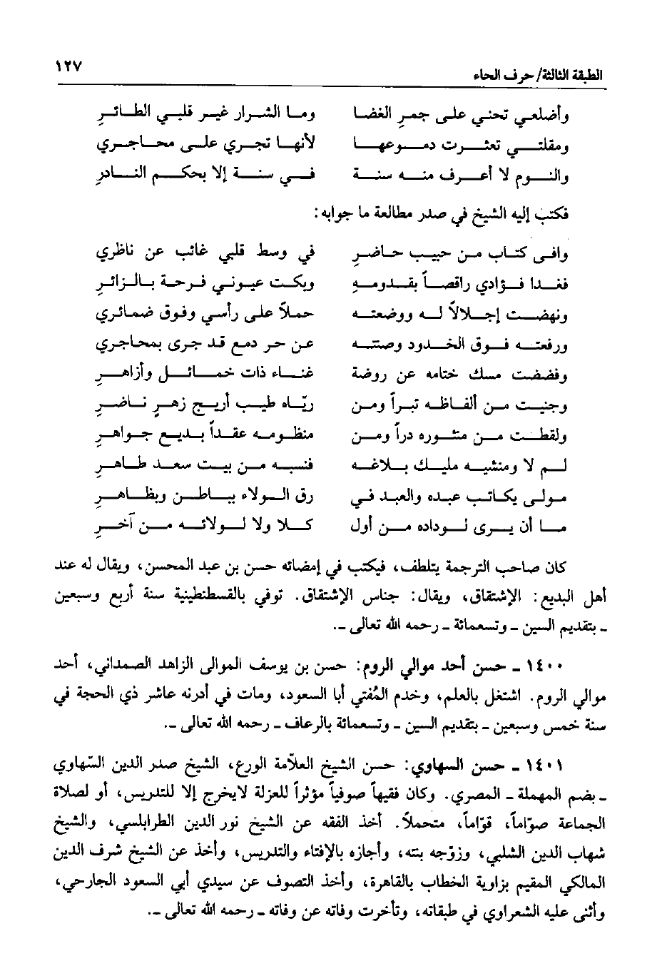 حسن الشيخ العلامة الورع، الشيخ صدر الدين السهاوي بضم المهملة المصري. وكان فقيهاً صوفياً مؤثراً للعزلة لا يخرج إلا للتدريس، أو لصلاة الجماعة صواماً، قواماً، متحملاً. أخذ الفقه عن الشيخ نور الدين الطرابلسي، والشيخ شهاب الدين الشلبي، وزوجه بنته، وأجازه بالإفتاء والتدريس، وأخذ عن الشيخ شرف الدين المالكي المقيم بزاوية الخطاب بالقاهرة، وأخد التصوف عن سيدي أبي السعود الجارحي، وأثنى عليه الشعراوي في طبقاته، وتأخرت وفاته عن وفاته رحمه الله تعالى.