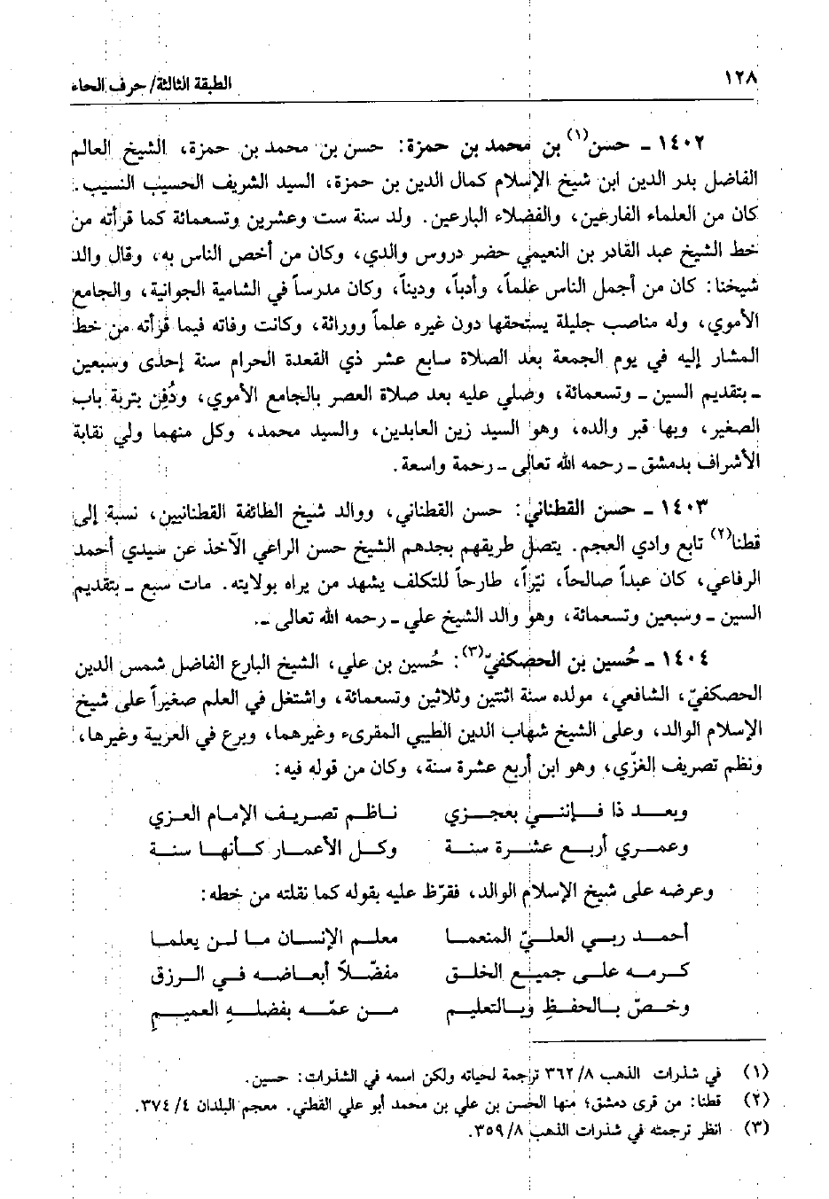 حسن بن محمد بن حمزة، الشيخ العالم الفاضل بدر الدين ابن شيخ الإسلام كمال الدين بن حمزة، السيد الشريف الحسيب النسيب. كان من العلماء الفارعين، والفضلاء البارعين. ولد سنة ست وعشرين وتسعمائة كما قرأته من خط الشيخ عبد القادر بن النعيمي حضر دروس والدي، وكان من أخص الناس به، وقال والد شيخنا: كان من أجمل الناس علماً، وأدباً، وديناً، وكان مدرساً في الشامية الجوانية، والجامع الأموي، وله مناصب جليلة يستحقها دون غيره علماً ووراثةً، وكانت وفاته فيما قرأته من خط المشار إليه في يوم الجمعة بعد الصلاة سابع عشر ذي القعدة الحرام سنة إحدى وسبعين بتقديم السين وتسعمائة، وصلي عليه بعد صلاة العصر بالجامع الأموي، ودفن بتربة باب الصغير، وبها قبر والده، وهو السيد زين العابدين، والسيد محمد، وكل منهما ولي نقابة الأشراف بدمشق رحمه الله تعالى رحمة واسعة.