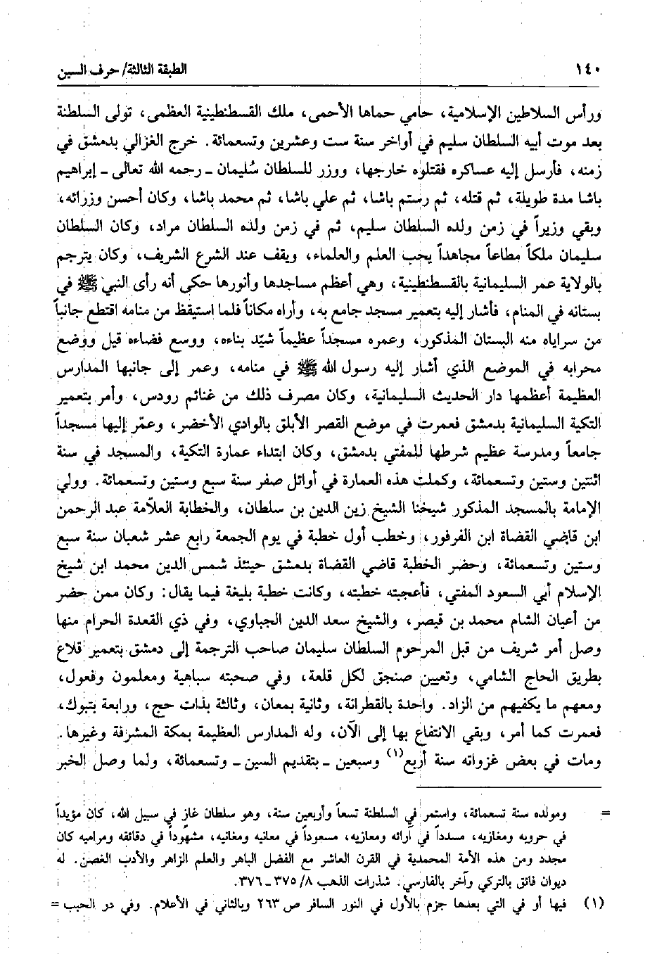 ورأس السلاطين الإسلامية، حامي حماها الأحمى، ملك القسطنطينية العظمى، تولى السلطنة بعد موت أبيه السلطان سليم في أواخر سنة ست وعشرين وتسعمائة. خرج الغزالي بدمشق في زمنه، فأرسل إليه عساكره فقتلوه خارجها، ووزر للسلطان سليمان رحمه الله تعالى إبراهيم باشا مدة طويلة، ثم قتله، ثم رستم باشا، ثم علي باشا، ثم محمد باشا، وكان أحسن وزرائه، وبقي وزيراً في زمن ولده السلطان سليم، ثم في زمن ولده السلطان مراد، وكان السلطان سليمان ملكاً مطاعاً مجاهداً يحب العلم والعلماء، ويقف عند الشرع الشريف، وكان يترجم بالولاية عمر السليمانية بالقسطنطينية، وهي أعظم مساجدها وأنورها حكى أنه رأى النبي صلى الله عليه وسلم في بستانه في المنام، فأشار إليه بتعمير مسجد جامع به، وأراه مكاناً فلما استيقظ من منامه اقتطع جانباً من سراياه منه البستان المذكور، وعمره مسجداً عظيماً شيد بناءه، ووسع فضاءه قيل ووضع محرابه في الموضع الذي أشار إليه رسول الله صلى الله عليه وسلم في منامه، وعمر إلى جانبها المدارس العظيمة أعظمها دار الحديث السليمانية، وكان مصرف ذلك من غنائم رودس، وأمر بتعمير التكية السليمانية بدمشق فعمرت في موضع القصر الأبلق بالوادي الأخضر، وعمر إليها مسجداً جامعاً ومدرسة عظيم شرطها للمفتي بدمشق، وكان ابتداء عمارة التكية، والمسجد في سنة اثنتين وستين وتسعمائة، وكملت هذه العمارة في أوائل صفر سنة سبع وستين وتسعمائة. وولي الإمامة بالمسجد المذكور شيخنا الشيخ زين الدين بن سلطان، والخطابة العلامة عبد الرحمن ابن قاصي القضاة ابن الفرفور، وخطب أول خطبة في يوم الجمعة رابع عشر شعبان سنة سبع وستين وتسعمائة، وحضر الخطبة قاضي القضاة بدمشق حينئذ شمس الدين محمد ابن شيخ الإسلام أبي السعود المفتي، فأعجبته خطبته، وكانت خطبة بليغة فيما يقال: وكان ممن حضر من أعيان الشام محمد بن قيصر، والشيخ سعد الدين الجباوي، وفي ذي القعدة الحرام منها وصل أمر شريف من قبل المرحوم السلطان سليمان صاحب الترجمة إلى دمشق بتعمير قلاع بطريق الحاج الشامي، وتعيين صنجق لكل قلعة، وفي صحبته سباهية ومعلمون وفعول، ومعهم ما يكفيهم من الزاد. واحدة بالقطرانة، وثانية بمعان، وثالثة بذات حج، ورابعة بتبوك، فعمرت كما أمر، وبقي الانتفاع بها إلى الآن، وله المدارس العظيمة بمكة المشرفة وغيرها. ومات في بعض غزواته سنة أربع وسبعين بتقديم السين وتسعمائة، ولما وصل الخبر