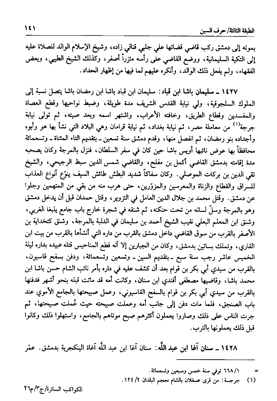 سليمان ابن قباد باشا ابن رمضان باشا يتصل نسبة إلى الملوك السلجوقية، ولي نيابة القدس الشريف مدة طويلة، وضبط نواحيها وقطع العصاة والمفسدين وقطاع الطريق، وخافته الأعراب، وأشتهر اسمه وبعد صيته، ثم تولى نيابة جرجة من معاملة مصر ثم نيابة بغداد، ثم نيابة قرامان وهي البلاد التي نشأ بها هو وأبوه وأجداده بنو رمضان، ثم أنفصل منها، وقدم دمشق سنة تسعين بتقديم التاء المثناة وتسعمائة محافظاً بها عوض نائبها أويس باشا حين كان في سفر السلطان، فنزل بالمرجة وكان يصحبه مدة إقامته بدمشق القاضي أكمل بن مفلح، والقاضي شمس الدين سبط الرجيحي، والشيخ تقي الدين بن بركات الموصلي. وكان سفاكاً شديد البطش طائش السيف ينوع أنواع العذاب للسراق والقطاع والزناة والمعرسين والمزورين، حتى هرب منه من بقي من المتهمين وجلوا عن دمشق. وقتل محمد بن جلال الدين العامل في التزوير، وقتل حمدان قبل أن يدخل دمشق وهو بالمرجة وسل لسانه من تحت حنكنه، ثم شنقه في شجرة خارج باب جامع يلبغا الغربي، وشنق ابن المعلم البعلي نقيب الشيخ أحمد بن سليمان في الدلبة بالمرجة، وشنق كتخداية بن الأصفر بالقرب من سوق القاضي داخل دمشق بالقرب من داره التي أنشأها بالقرب من بيت ابن القاري، وتملك بساتين بدمشق، وكان من الجبارين إلا أنه قطع المناحيس قتله عبيده بداره ليلة الخميس عاشر رجب سنة سبع بتقديم السين وتسعين وتسعمائة، ودفن بسفح قاسيون، بالقرب من سيدي أبي بكر بن قوام بعد أن كشف عليه في داره بأمر نائب الشام حسن باشا ابن محمد باشا، وقاضيها مصطفى أفندي ابن سنان، وكانت أمه قد ماتت قبله بنحو أشهر فدفنها بالقرب من سيدي أبي بكر بن قوام بالسفح القاسيوني، وعمل صبيحتها بالجامع الأموي عند باب الصنجق، فلما مات دفن إلى جانب أمه وعملت صبيحته حيث عملت صبيحتها، ثم جرت الناس على ذلك وصاروا يعملون أكثرهم صبح موتاهم بالجامع، واستهلوا ذلك وكانوا قبل ذلك يعملونها بالترب.