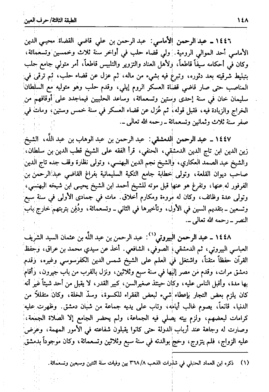 عبد الرحمن بن عبد الله بن عثمان السيد الشريف العباسي البيروتي، ثم الدمشقي، الصوفي، الشافعي. أخذ عن سيدي محمد بن عراق، وحفظ القرآن حفظاً متقناً، واشتغل في العلم على الشيخ شمس الدين الكفرسوسي وغيره، وقدم دمشق مرات، وقدم من مصر إليها في سنة سبع وثلاثين، ونزل بالقرب من باب جيرون، وأقام بها مدة، وأقبل الناس عليه، وكان حينئذ صغيرالسن، كبير القدر، لا يقبل من أحد شيئاً غير أنه كان يلزم بعض التجار بإعطاء شيء لبعض الفقراء للكسوة، وسد الخلة، وكان متقللاً من الدنيا، قانعاً، يصوم غالب أيامه، وتاب على يديه جماعة من شبان دمشق. وظهرت عليه كرامات لبعضهم، ولزم بيته يصلي فيه الجماعة، ولم يحضر الجامع إلا الصلاة الجمعة، وصارت له وجاهة عند أرباب الدولة حتى كانوا يقبلون شفاعته في الأمور المهمة، وعرض عليه الزواج، فلم يتزوج، وحج بوالدته في سنة سبع وثلاثين وتسعمائة، وكان موجوداً بدمشق