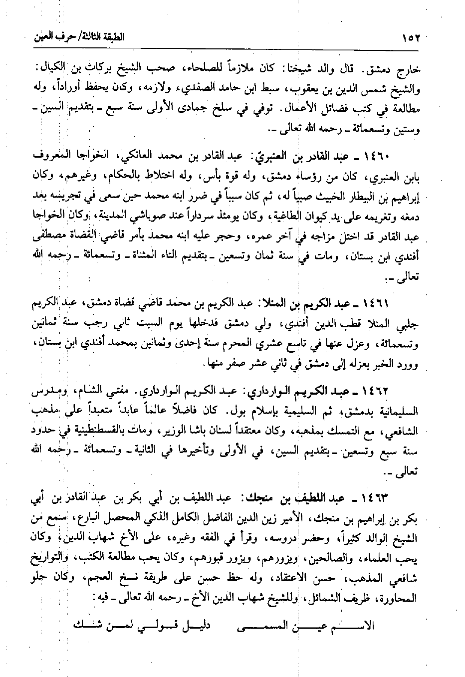 عبد الكريم الوارداري. مفتي الشام، ومدرس السليمانية بدمشق، ثم السليمية بإسلام بول. كان فاضلاً عالماً عابداً متعبداً على مذهب الشافعي، مع التمسك بمذهبه، وكان معتقداً لسنان باشا الوزير، ومات بالقسطنطينية في حدود سنة سبع وتسعين بتقديم السين، في الأولى وتأخيرها في الثانية وتسعمائة رحمه الله تعالى.