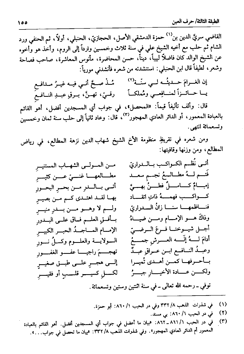 القاضي سري الدين بن حمزة الدمشقي الأصل، الحجازي، الحنبلي، أولاً، ثم الحنفي ورد الشام ثم حلب مع أخيه الشيخ علي في سنة ثلاث وخمسين وارداً إلى الروم، وأخذ هو وأخوه عن الشيخ الوالد كان فاضلاً لبيياً، ديناً، حسن المحاضرة، مأنوس المعاشرة، صاحب فصاحة وشعر، لطيفاً قال ابن الحنبلي: استنشدته من شعره فأنشدني مورياً: