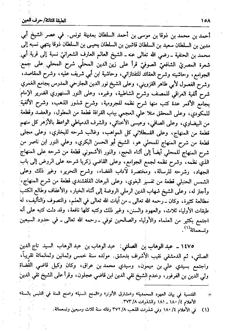 أحمد بن محمد بن ذوقا بن موسى بن أحمد السلطان بمدينة تونس. في عصر الشيخ أبي مدين بن السلطان سعيد بن السلطان قاشين بن السلطان يحيى بن السلطان ذوقا ينتهي نسبه إلى محمد بن الحنفية رضي الله تعالى عنه الشيخ العالم العارف الشعراني نسبة إلى قرية أبي شعرة المصري الشافعي الصوفي قرأ على زين الدين المحلي شرح المحلي على جمع الجوامع، وحاشيته وشرح العقائد للتفتازاني، وحاشية ابن أبي شريف عليه، وشرح المقاصد، وشرح الفصول لأبي طاهر القزويني، وعلى الشيخ نور الدين الجارحي المدرس بجامع الغمري شرح ألفية العراقي للمصنف وشرح الشاطبية، وغيره، وعلى النور السنهوري الضرير الإمام بجامع الأقمر عدة كتب منها شرح نظمه للجرومية، وشرح شذور الذهب، وشرح الألفية للمكودي، وعلى المحقق منلا علي العجمي بباب القرافة قطعة من المطول، والعضد وقطعة من البيضاوي، وعلى الصافي، وعيسى الأخنائي، والشرف الدمياطي الواعظ بالأزهر كل منهم قطعة من المنهاج، وعلى القسطلاني كل المواهب، وغالب شرحه للبخاري، وعلى مجلى قطعة من شرح المنهاج للمحلي هو، الشيخ أبو الحسن البكري، وعلي النور ابن ناصر من شرح المنهاج حلي أيضاً إلى أثناء الحج، والنور الأشموني قطعة من شرحه على المنهاج الذي نظمه، وشرح نظمه لجمع الجوامع، وعلى القاضي زكريا شرحه على الروض إلى باب الجهاد، وشرحه للرسالة، ومختصرة لآداب القضاء، وشرح التحرير، وغير ذلك وعلى الشمس الحنبلي قطعة من تفسير البغوي، وعلى البرهان القلقشندي قطعة من شرح المنهاج، وأجاز له، وعلى الشيخ شهاب الدين الرملي الروضة إلى أثناء الخيار، والأعفاف وطالع الكتب مطالعة كثيرة، وكان رحمه الله تعالى من آيات الله تعالى في العلم، والتصوف والتأليف، له طبقات الأولياء ثلاث، والعهود والسنن، وغير ذلك وكتبه كلها نافعة، وقد ثلت كتبه على أنه أجتمع بكثير من العلماء والأولياء والصالحين توفي رحمه الله تعالى في حدود السبعين وتسعمائة.