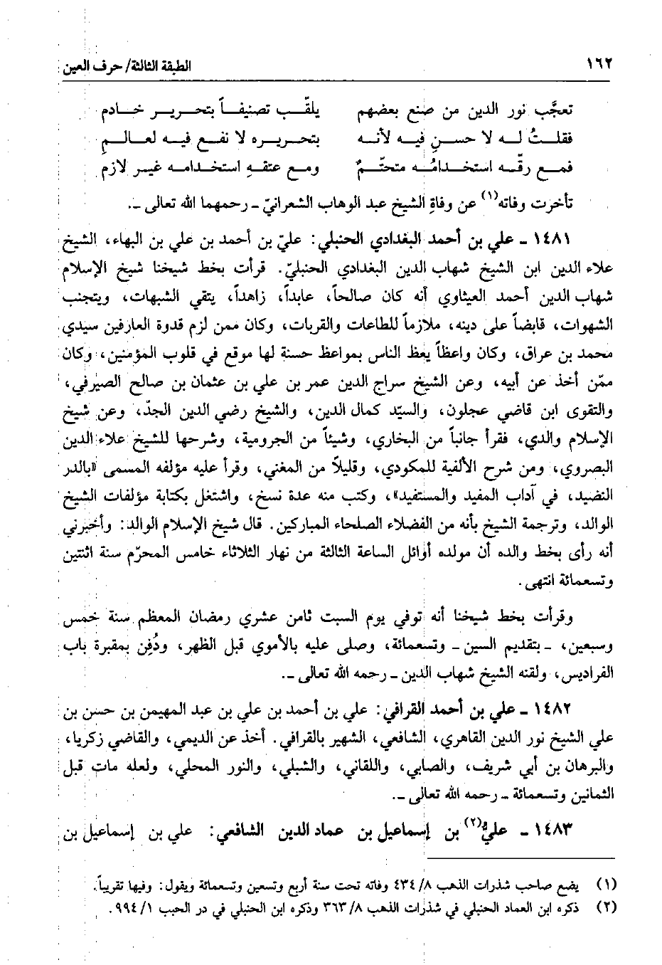 علي بن أحمد بن علي بن البهاء، الشيخ علاء الدين ابن الشيخ شهاب الدين البغدادي الحنبلي. قرأت بخط شيخنا شيخ الإسلام شهاب الدين أحمد العيثاوي أنه كان صالحاً، عابداً، زاهداً، يتقي الشبهات، ويتجنب الشهوات، قابضاً على دينه، ملازماً للطاعات والقربات، وكان ممن لزم قدوة العارفين سيدي محمد بن عراق، وكان واعظاً يعظ الناس بمواعظ حسنة لها موقع في قلوب المؤمنين، وكان ممن أخذ عن أبيه، وعن الشيخ سراج الدين عمر بن علي بن عثمان بن صالح الصيرفي، التقوى ابن قاضي عجلون، والسيد كمال الدين، والشيخ رضي الدين الجد، وعن شيخ الإسلام والدي، فقرأ جانباً من البخاري، وشيئاً من الجرومية، وشرحها للشيخ علاء الدين البصروي، ومن شرح الألفية للمكودي، وقليلاً من المغني، وقرأ عليه مؤلفه المسمى بالدر النضيد، في آداب المفيد والمستفيد، وكتب منه عدة نسخ، واشتغل بكتابة مؤلفات الشيخ الوالد، وترجمة الشيخ بأنه من الفضلاء الصلحاء المباركين. قال شيخ الإسلام الوالد: وأخبرني أنه رأى بخط والده أن مولده أوائل الساعة الثالثة من نهار الثلاثاء خامس المحرم سنة اثنتين وتسعمائة انتهى.