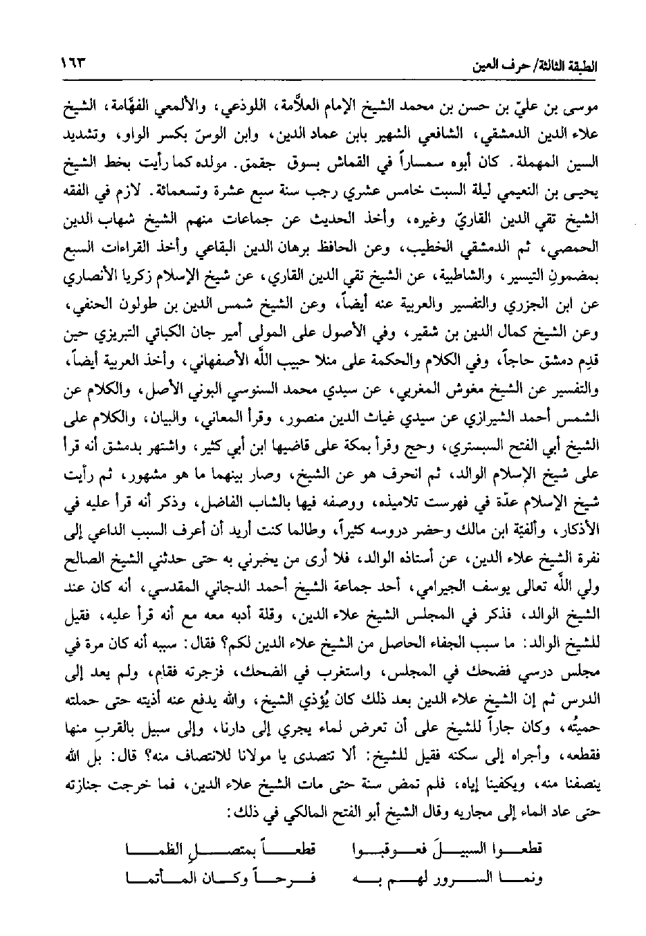 موسى بن علي بن حسن بن محمد الشيخ الإمام العلامة، اللوذعي، والألمعي الفهامة، الشيخ علاء الدين الدمشقي، الشافعي الشهير بابن عماد الدين، وابن الوس بكسر الواو، وتشديد السين المهملة. كان أبوه سمساراً في القماش بسوق جقمق. مولده كما رأيت بخط الشيخ يحيى بن النعيمي ليلة السبت خامس عشري رجب سنة سبع عشرة وتسعمائة. لازم في الفقه الشيخ تقي الدين القاري وغيره، وأخذ الحديث عن جماعات منهم الشيخ شهاب الدين الحمصي، ثم الدمشقي الخطيب، وعن الحافظ برهان الدين البقاعي وأخذ القراءات السبع بمضمون التيسير، والشاطبية، عن الشيخ تقي الدين القاري، عن شيخ الإسلام زكريا الأنصاري عن ابن الجزري والتفسير والعربية عنه أيضاً، وعن الشيخ شمس الدين بن طولون الحنفي، وعن الشيخ كمال الدين بن شقير، وفي الأصول على المولى أمير جان الكبائي التبريزي حين قدم دمشق حاجاً، وفي الكلام والحكمة على منلا حبيب الله الأصفهاني، وأخذ العربية أيضاً، والتفسير عن الشيخ مغوش المغربي، عن سيدي محمد السنوسي البوني الأصل، والكلام عن الشمس أحمد الشيرازي عن سيدي غياث الدين منصور، وقرأ المعاني، والبيان، والكلام على الشيخ أبي الفتح السبستري، وحج وقرأ بمكة على قاضيها ابن أبي كثير، واشتهر بدمشق أنه قرأ على شيخ الإسلام الوالد، ثم انحرف هو عن الشيخ، وصار بينهما ما هو مشهور، ثم رأيت شيخ الاسلام عدة في فهرست تلاميذه، ووصفه فيها بالشاب الفاضل، وذكر أنه قرأ عليه في الأذكار، وألفية ابن مالك وحضر دروسه كثيراً، وطالما كنت أريد أن أعرف السبب الداعي إلى نفرة الشيخ علاء الدين، عن أستاذه الوالد، فلا أرى من يخبرني به حتى حدثني الشيخ الصالح ولي الله تعالى يوسف الجيرامي، أحد جماعة الشيخ أحمد الدجاني المقدسي، أنه كان عند الشيخ الوالد، فذكر في المجلس الشيخ علاء الدين، وقلة أدبه معه مع أنه قرأ عليه، فقيل للشيخ الوالد: ما سبب الجفاء الحاصل من الشيخ علاء الدين لكم؟ فقال: سببه أنه كان مرة في مجلس درسي فضحك في المجلس، واستغرب في الضحك، فزجرته فقام، ولم يعد إلى الدرس ثم إن الشيخ علاء الدين بعد ذلك كان يؤذي الشيخ، والله يدفع عنه أذيته حتى حملته حميته، وكان جاراً للشيخ على أن تعرض لماء يجري إلى دارنا، وإلى سبيل بالقرب منها فقطعه، وأجراه إلى سكنه فقيل للشيخ: ألا تتصدى يا مولانا للانتصاف منه؟ قال: بل الله ينصفنا منه، ويكفينا إياه، فلم تمض سنة حتى مات الشيخ علاء الدين، فما خرجت جنازته حتى عاد الماء إلى مجاريه وقال الشيخ أبو الفتح المالكي في ذلك: