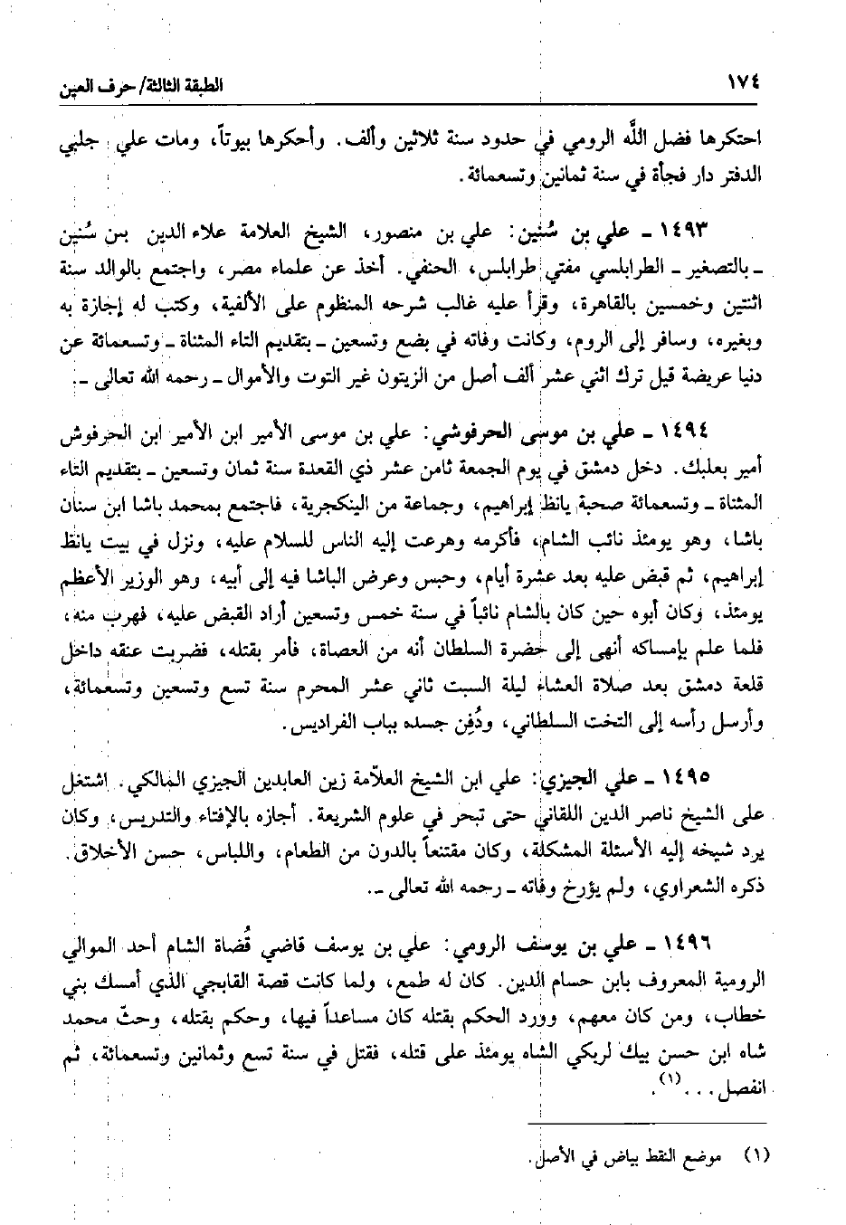 علي بن منصور، الشيخ العلامة علاء الدين بن سنين بالتصغير الطرابلسي مفتي طرابلس، الحنفي. أخذ عن علماء مصر، واجتمع بالوالد سنة اثنتين وخمسين بالقاهرة، وقرأ عليه غالب شرحه المنظوم على الألفية، وكتب له إجازة به وبغيره، وسافر إلى الروم، وكانت وفاته في بضع وتسعين بتقديم التاء المثناة وتسعمائة عن دنيا عريضة قيل ترك اثني عشر ألف أصل من الزيتون غير التوت والأموال رحمه الله تعالى.