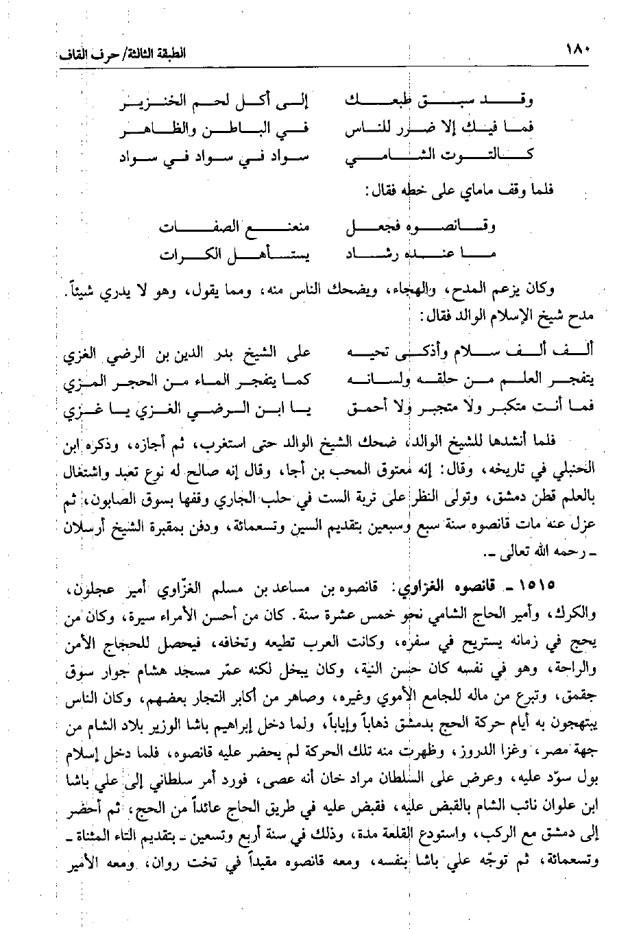 قانصوه بن مساعد بن مسلم الغزاوي أمير عجلون، والكرك، وأمير الحاج الشامي نحو خمس عشرة سنة. كان من أحسن الأمراء سيرة، وكان من يحج في زمانه يستريح في سفره، وكانت العرب تطيعه وتخافه، فيحصل للحجاج الأمن والراحة، وهو في نفسه كان حسن النية، وكان يبخل لكنه عمر مسجد هشام جوار سوق جقمق، وتبرع من ماله للجامع الأموي وغيره، وصاهر من أكابر التجار بعضهم، وكان الناس يبتهجون به أيام حركة الحج بدمشق ذهاباً وإياباً، ولما دخل إبراهيم باشا الوزير بلاد الشام من جهة مصر، وغزا الدروز، وظهرت منه تلك الحركة لم يحضر عليه قانصوه، فلما دخل إسلام بول سود عليه، وعرض على السلطان مراد خان أنه عصى، فورد أمر سلطاني إلى علي باشا ابن علوان نائب الشام بالقبض عليه، فقبض عليه في طريق الحاج عائداً من الحج، ثم أحضر إلى دمشق مع الركب، واستودع القلعة مدة، وذلك في سنة أربع وتسعين بتقديم التاء المثناة وتسعمائة، ثم توجه علي باشا بنفسه، ومعه قانصوه مقيداً في تخت روان، ومعه الأمير