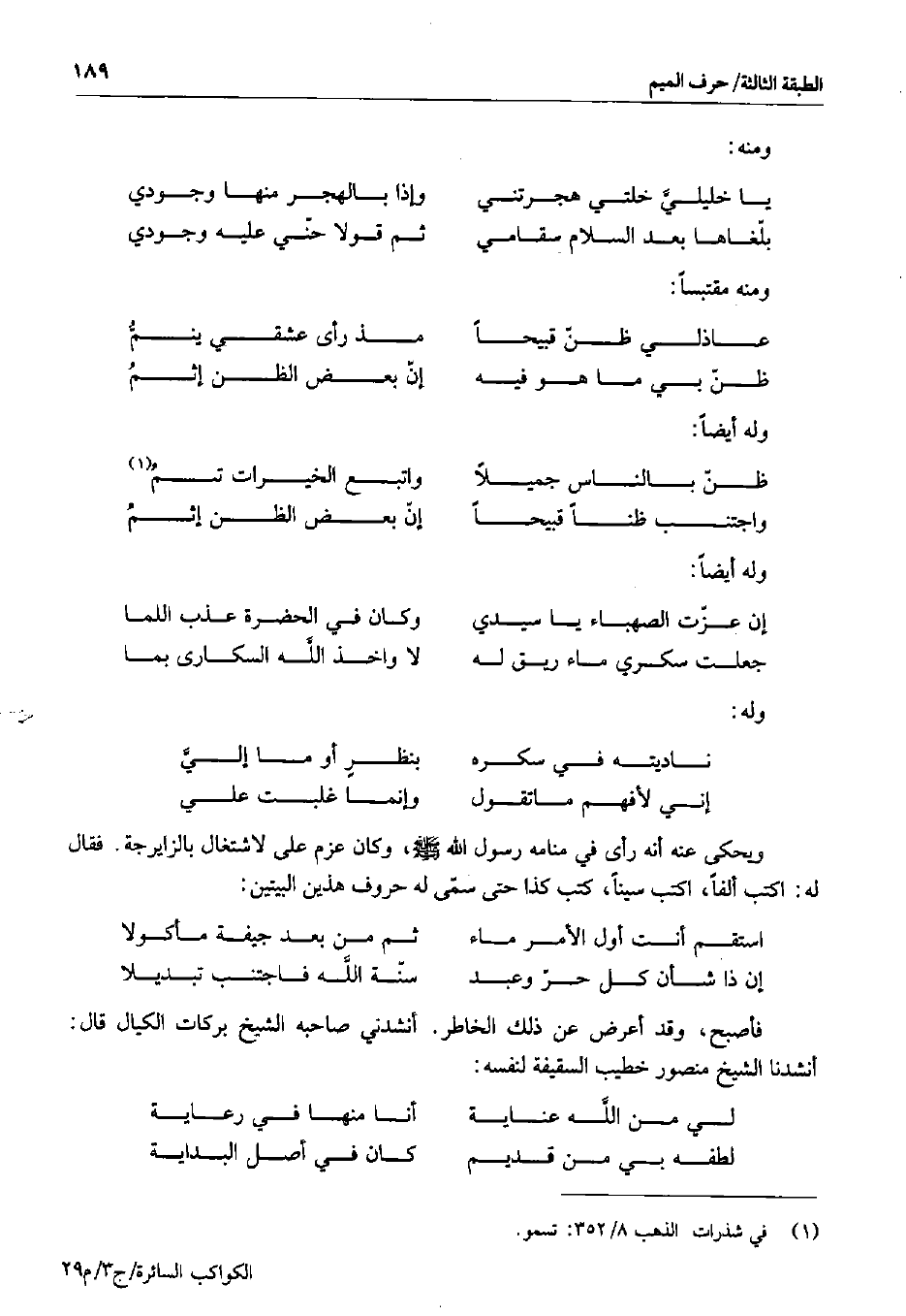 فأصبح، وقد أعرض عن ذلك الخاطر. أنشدني صاحبه الشيخ بركات الكيال قال: أنشدنا الشيخ منصور خطيب السقيفة لنفسه: