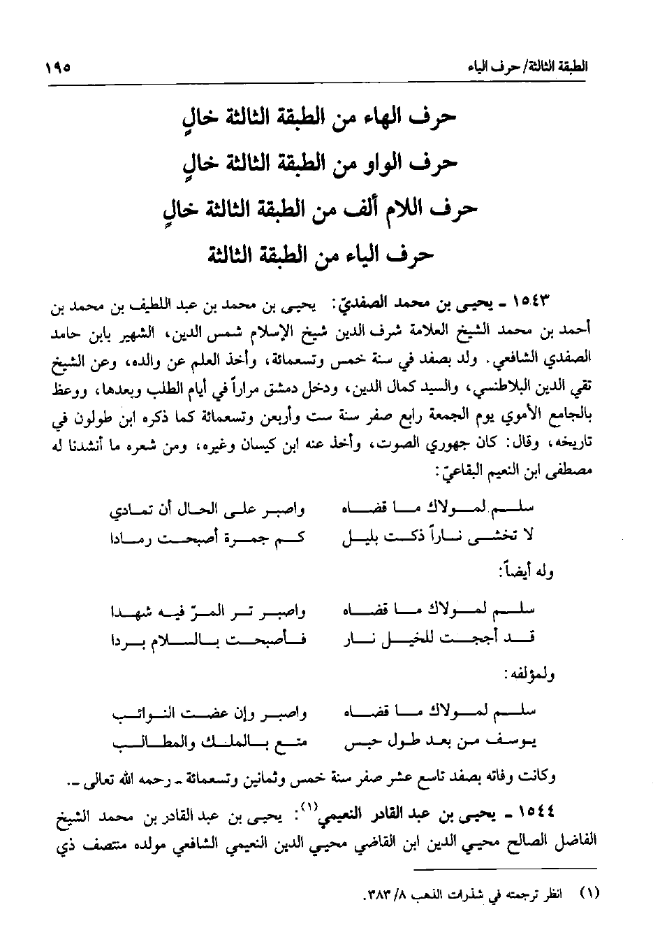 يحيى بن محمد بن عبد اللطيف بن محمد بن أحمد بن محمد الشيخ العلامة شرف الدين شيخ الإسلام شمس الدين، الشهير بابن حامد الصفدي الشافعي. ولد بصفد في سنة خمس وتسعمائة، وأخذ العلم عن والده، وعن الشيخ تقي الدين البلاطنسي، والسيد كمال الدين، ودخل دمشق مراراً في أيام الطلب وبعدها، وبالجامع الأموي يوم الجمعة رابع صفر سنة ست وأربعون وتسعمائة كما ذكره ابن طولون في تاريخه، وقال: كان جهوري الصوت، وأخذ عنه ابن كيسان وغيره، ومن شعره ما أنشدنا له مصطفى ابن النعيم البقاعي: