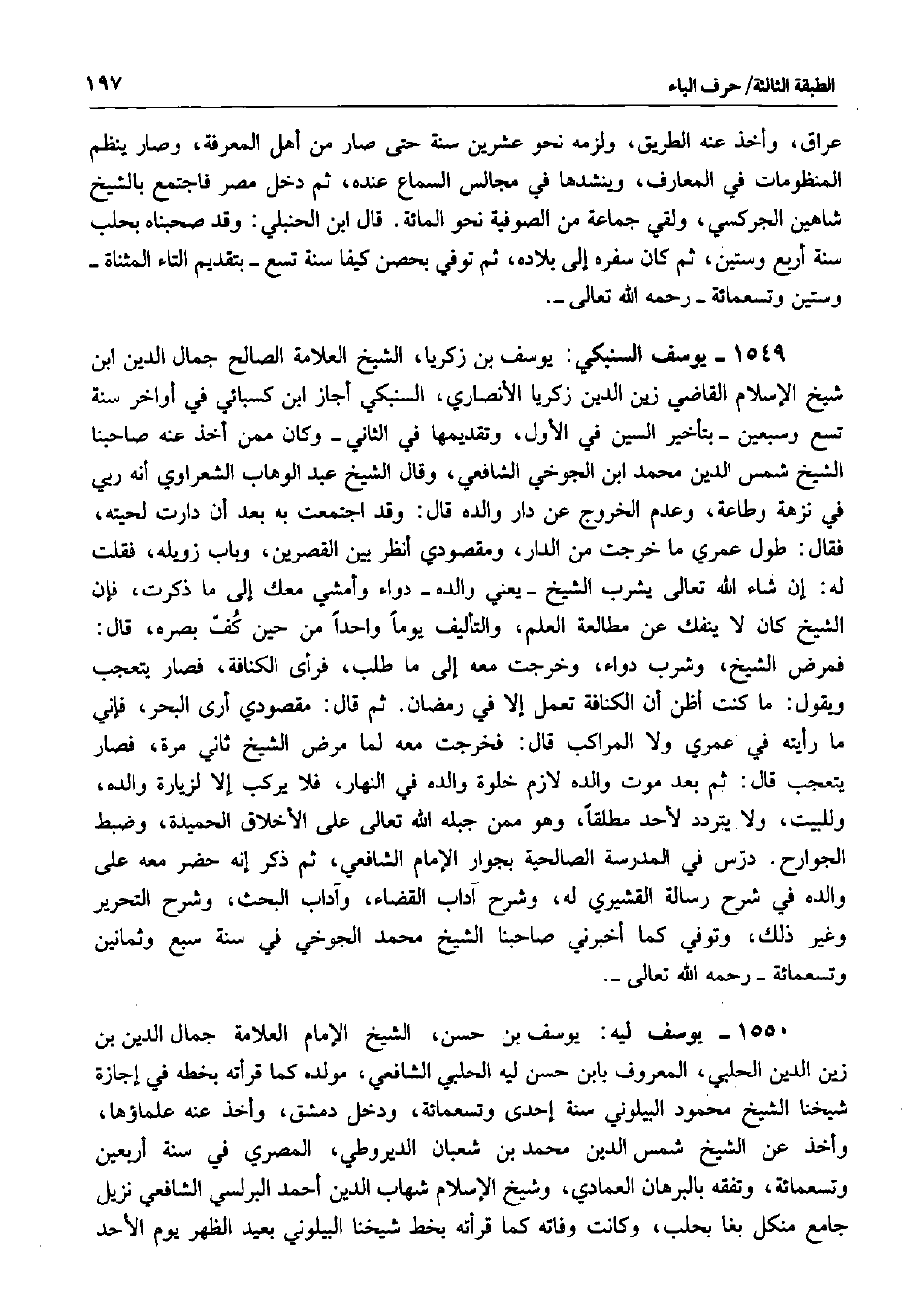 يوسف بن زكريا، الشيخ العلامة الصالح جمال الدين ابن شيخ الإسلام القاضي زين الدين زكريا الأنصاري، السنبكي أجاز ابن كسبائي في أواخر سنة تسع وسبعين بتأخير السين في الأول، وتقديمها في الثاني وكان ممن أخذ عنه صاحبنا الشيخ شمس الدين محمد ابن الجوخي الشافعي، وقال الشيخ عبد الوهاب الشعراوي أنه ربي في نزهة وطاعة، وعدم الخروج عن دار والده قال: وقد اجتمعت به بعد أن دارت لحيته، فقال: طول عمري ما خرجت من الدار، ومقصودي أنظر بين القصرين، وباب زويله، فقلت له: إن شاء الله تعالى يشرب الشيخ يعني والده دواء وأمشي معك إلى ما ذكرت، فإن الشيخ كان لا ينفك عن مطالعة العلم، والتأليف يوماً واحداً من حين كف بصره، قال: فمرض الشيخ، وشرب دواء، وخرجت معه إلى ما طلب، فرأى الكنافة، فصار يتعجب ويقول: ما كنت أظن أن الكنافة تعمل إلا في رمضان. ثم قال: مقصودي أرى البحر، فإني ما رأيته في عمري ولا المراكب قال: فخرجت معه لما مرض الشيخ ثاني مرة، فصار يتعجب قال: ثم بعد موت والده لازم خلوة والده في النهار، فلا يركب إلا لزيارة والده، وللبيت، ولا يتردد لأحد مطلقاً، وهو ممن جبله الله تعالى على الأخلاق الحميدة، وضبط الجوارح. درس في المدرسة الصالحية بجوار الإمام الشافعي، ثم ذكر إنه حضر معه على والده في شرح رسالة القشيري له، وشرح آداب القضاء، وآداب البحث، وشرح التحرير وغير ذلك، وتوفي كما أخبرني صاحبنا الشيخ محمد الجوخي في سنة سبع وثمانين وتسعمائة رحمه الله تعالى.