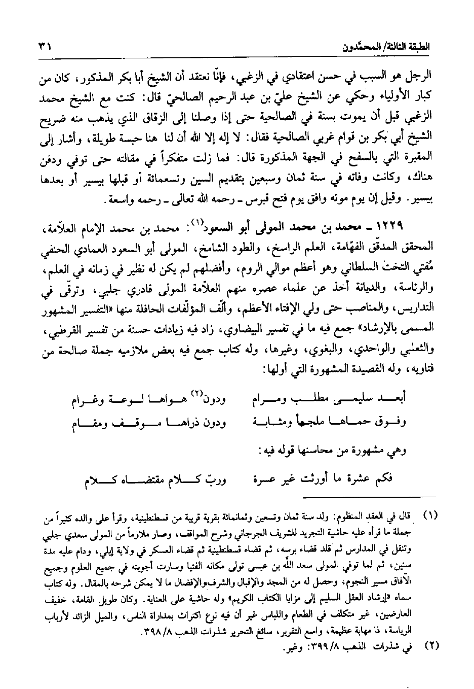 محمد بن محمد الإمام العلامة، المحقق المدقق الفهامة، العلم الراسخ، والطود الشامخ، المولى أبو السعود العمادي الحنفي مفتي التخت السلطاني وهو أعظم موالي الروم، وأفضلهم لم يكن له نظير في زمانه في العلم، والرئاسة، والديانة أخذ عن علماء عصره منهم العلامة المولى قادري جلبي، وترقى في التداريس، والمناصب حتى ولي الإفتاء الأعظم، وألف المؤلفات الحافلة منها التفسير المشهور المسمى بالإرشاد جمع فيه ما في تفسير البيضاوي، زاد فيه زيادات حسنة من تفسير القرطبي، والثعلبي والواحدي، والبغوي، وغيرها، وله كتاب جمع فيه بعض ملازميه جملة صالحة من فتاويه، وله القصيدة المشهورة التي أولها:
