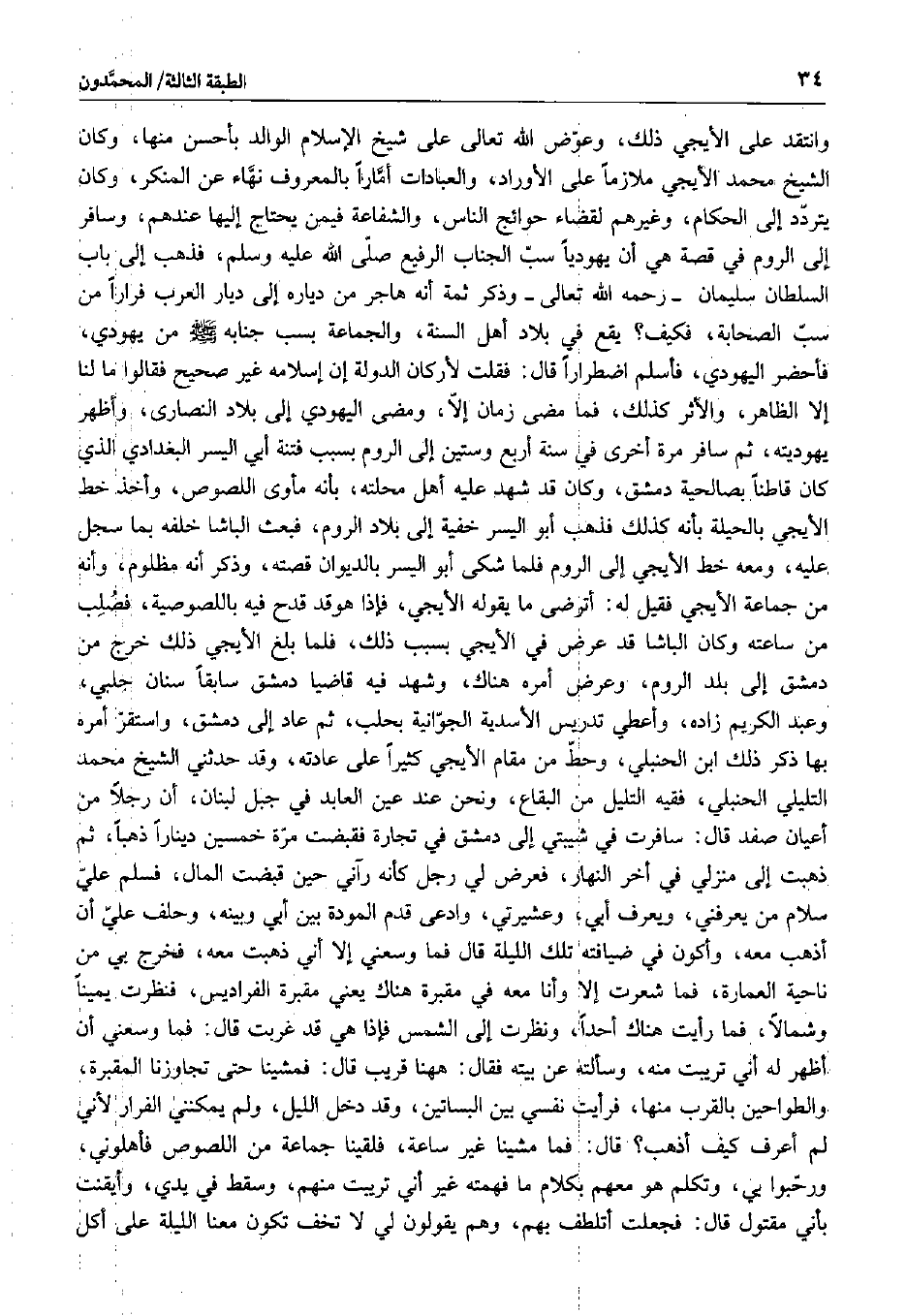 فقلت لأركان الدولة إن إسلامه غير صحيح فقالوا ما لنا إلا الظاهر، والأثر كذلك، فما مضى زمان إلا، ومضى اليهودي إلى بلاد النصارى، وأظهر يهوديته، ثم سافر مرة أخرى في سنة أربع وستين إلى الروم بسبب فتنة أبي اليسر البغدادي الذي كان قاطناً بصالحية دمشق، وكان قد شهد عليه أهل محلته، بأنه مأوى اللصوص، وأخذ خط الأيجي بالحيلة بأنه كذلك فذهب أبو اليسر خفية إلى بلاد الروم، فبعث الباشا خلفه بما سجل عليه، ومعه خط الأيجي إلى الروم فلما شكى أبو اليسر بالديوان قصته، وذكر أنه مظلوم، وأنه من جماعة الأيجي فقيل له: أترضى ما يقوله الأيجي، فإذا هو قد قدح فيه باللصوصية، فصلب من ساعته وكان الباشا قد عرض في الأيجي بسبب ذلك، فلما بلغ الأيجي ذلك خرج من دمشق إلى بلد الروم، وعرض أمره هناك، وشهد فيه قاضيا دمشق سابقاً سنان جلبي، وعبد الكريم زاده، وأعطي تدريس الأسدية الجوانية بحلب، ثم عاد إلى دمشق، واستقر أمره بها ذكر ذلك ابن الحنبلي، وحط من مقام الأيجي كثيراً على عادته، وقد حدثني الشيخ محمد التليلي الحنبلي، فقيه التليل من البقاع، ونحن عند عين العابد في جبل لبنان، أن رجلاً من أعيان صفد قال: سافرت في شيبتي إلى دمشق في تجارة فقبضت مرة خمسين ديناراً ذهباً، ثم ذهبت إلى منزلي في آخر النهار، فعرض لي رجل كأنه رآني حين قبضت المال، فسلم علي سلام من يعرفني، ويعرف أبي، وعشيرتي، وادعى قدم المودة بين أبي وبينه، وحلف علي أن أذهب معه، وأكون في ضيافته تلك الليلة قال فما وسعني إلا أني ذهبت معه، فخرج بي من ناحية العمارة، فما شعرت إلا وأنا معه في مقبرة هناك يعني مقبرة الفراديس، فنظرت يميناً وشمالاً، فما رأيت هناك أحداً، ونظرت إلى الشمس فإذا هي قد غربت قال: فما وسعني أن أظهر له أني تريبت منه، وسألته عن بيته فقال: ههنا قريب قال: فمشينا حتى تجاوزنا المقبرة، والطواحين بالقرب منها، فرأيت نفسي بين البساتين، وقد دخل الليل، ولم يمكنني الفرار لأني لم أعرف كيف أذهب؟ قال: فما مشينا غير ساعة، فلقينا جماعة من اللصوص فأهلوني، ورحبوا بي، وتكلم هو معهم بكلام ما فهمته غير أني تريبت منهم، وسقط في يدي، وأيقنت بأني مقتول قال: فجعلت أتلطف بهم، وهم يقولون لي لا تخف تكون معنا الليلة على أكل