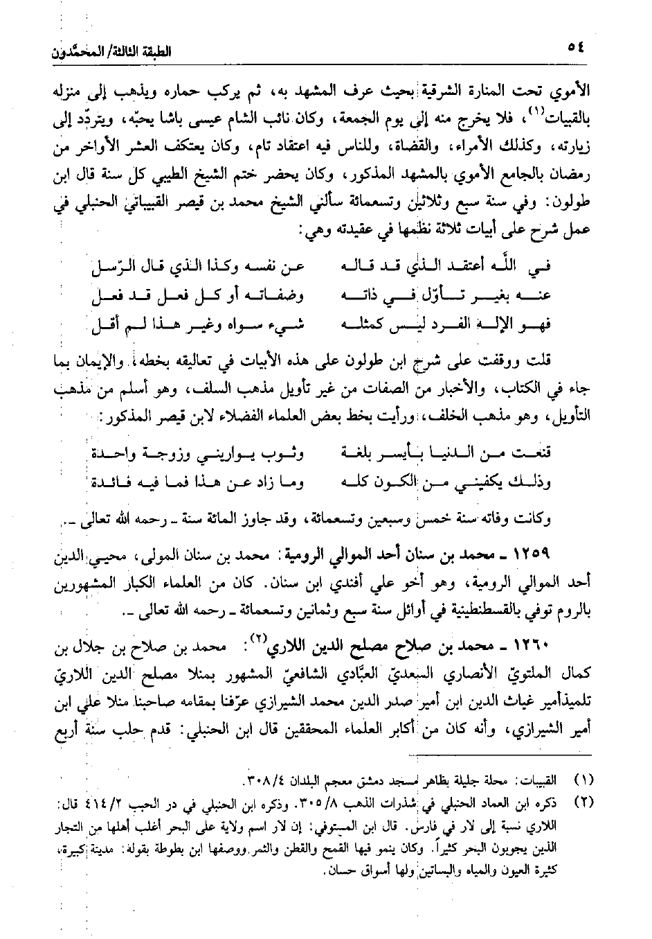 الأموي تحت المنارة الشرقية بحيث عرف المشهد به، ثم يركب حماره ويذهب إلى منزله بالقبيات، فلا يخرج منه إلى يوم الجمعة، وكان نائب الشام عيسى باشا يحبه، ويتردد إلى زيارته، وكذلك الأمراء، والقضاة، وللناس فيه اعتقاد تام، وكان يعتكف العشر الأواخر من رمضان بالجامع الأموي بالمشهد المذكور، وكان يحضر ختم الشيخ الطييي كل سنة قال ابن طولون: وفي سنة سبع وثلاثين وتسعمائة سألني الشيخ محمد بن قيصر القبيباتي الحنبلي في عمل شرح على أبيات ثلاثة نظمها في عقيدته وهي: