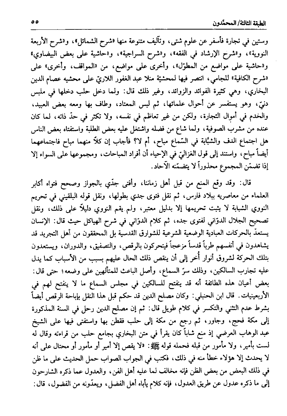 قال: وقد وقع المنع من قبل أهل زماننا، وأفتى جدي بالجواز وصحح فتواه أكابر العلماء من معاصريه ببلاد فارس، ثم نقل فتوى جدي بطولها، ونقل قوله البلقيني في تحريم النووي الشبابة لا يثبت تحريمها إلا بدليل معتبر، ولم يقم النووي دليلاً على ذلك، ونقل تصحيح الجلال الدواني لفتوى جده، ثم كلام الدواني في شرح الهياكل حيث قال: الإنسان يستعد بالحركات العبادية الوضعية الشرعية للشوارق القدسية بل المحققون من أهل التجريد قد يشاهدون في أنفسهم طرباً قدساً مزعجاً فيتحركون بالرقص، والتصفيق، والدوران، ويستعدون بتلك الحركة لشروق أنوار أخر إلى أن ينقص ذلك الحال عليهم بسبب من الأسباب كما يدل عليه تجارب السالكين، وذلك سر السماع، وأصل الباعث للمتألهين على وضعه، حتى قال: بعض أعيان هذه الطائفة أنه قد ينفتح للسالكين في مجلس السماع ما لا ينفتح لهم في الأربعينيات. قال ابن الحنبلي: وكان مصلح الدين قد حكم قبل هذا النقل بإباحة الرقص أيضاً بشرط عدم التثني والتكسر في كلام طويل قال: ثم إن مصلح الدين رحل في السنة المذكورة إلى مكة فحج، وجاور، ثم رجع من مكة إلى حلب فقطن بها واستفتى فيها على الشيخ عبد الوهاب العرضي إذ منع شاباً كان يقرأ في متن البخاري بجامع حلب من قراءته وقال له لست بأمير، ولا مأمور من قبله فحمله قوله صلى الله عليه وسلم: " ألا يقص إلا أمير أو مأمور أو محتال على أنه لا يحدث إلا هؤلاء خطأ منه في ذلك، فكتب في الجواب الصواب حمل الحديث على ما ظن في ذلك البعض من بعض الظن فإنه مخالف لما عليه أهل الفن، والعدول عما ذكره الشارحون إلى ما ذكره عدول عن طريق العدول، فإنه كلام يأباه أهل الفضل، ويعدونه من الفضول، قال: