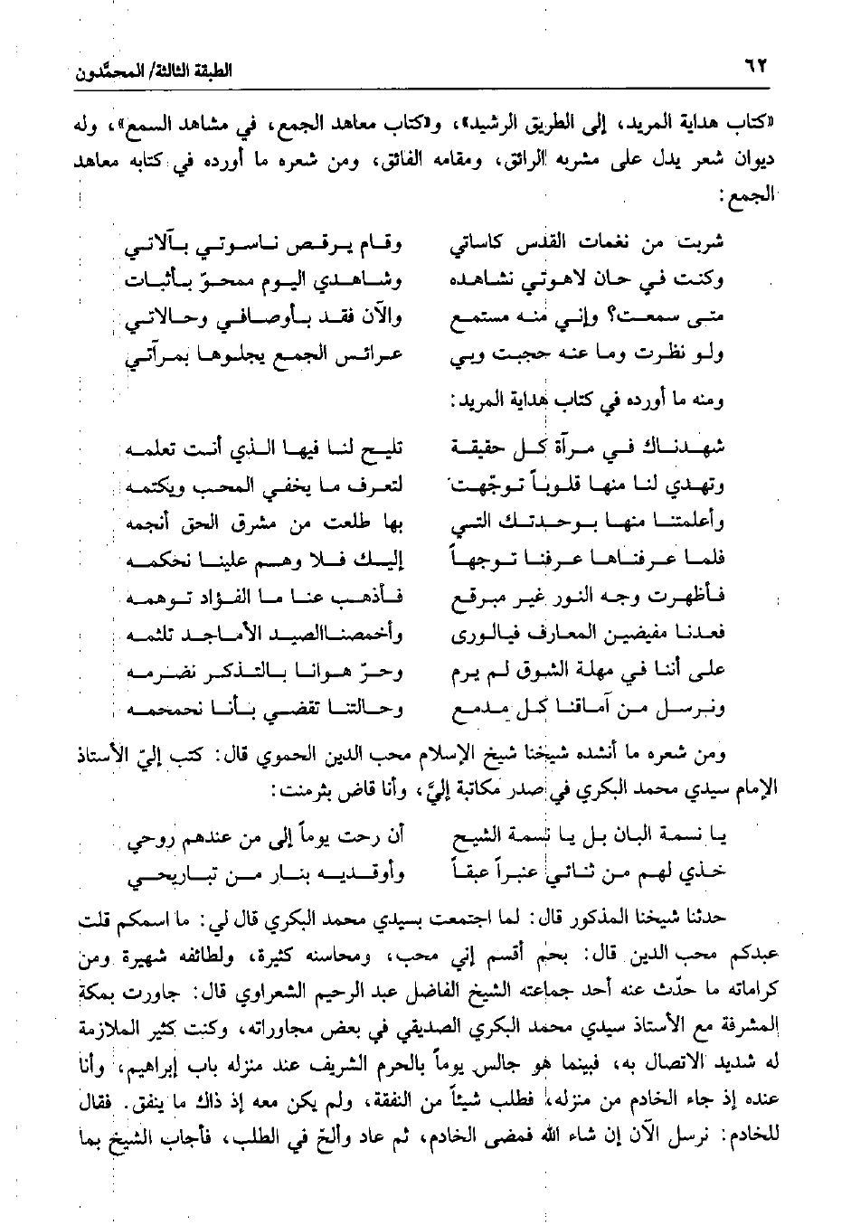 ومن شعره ما أنشده شيخنا شيخ الإسلام محب الدين الحموي قال: كتب إلي الأستاذ الإمام سيدي محمد البكري في صدر مكاتبة إلي، وأنا قاض بثرمنت: