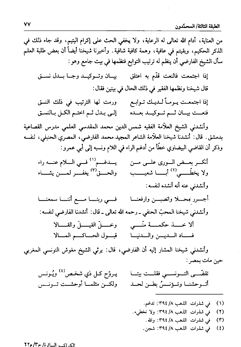 وأنشدني الشيخ العلامة الفقيه شمس الدين محمد المقدسي العلمي مدرس القصاعية بدمشق. قال: أنشدنا شيخنا العلامة الشاعر المجيد محمد الفارضي، المصري الحنبلي، لنفسه وذكر أن القاضي البيضاوي خطأ من أدغم الراء في اللام ونسبه إلى أبي عمرو: