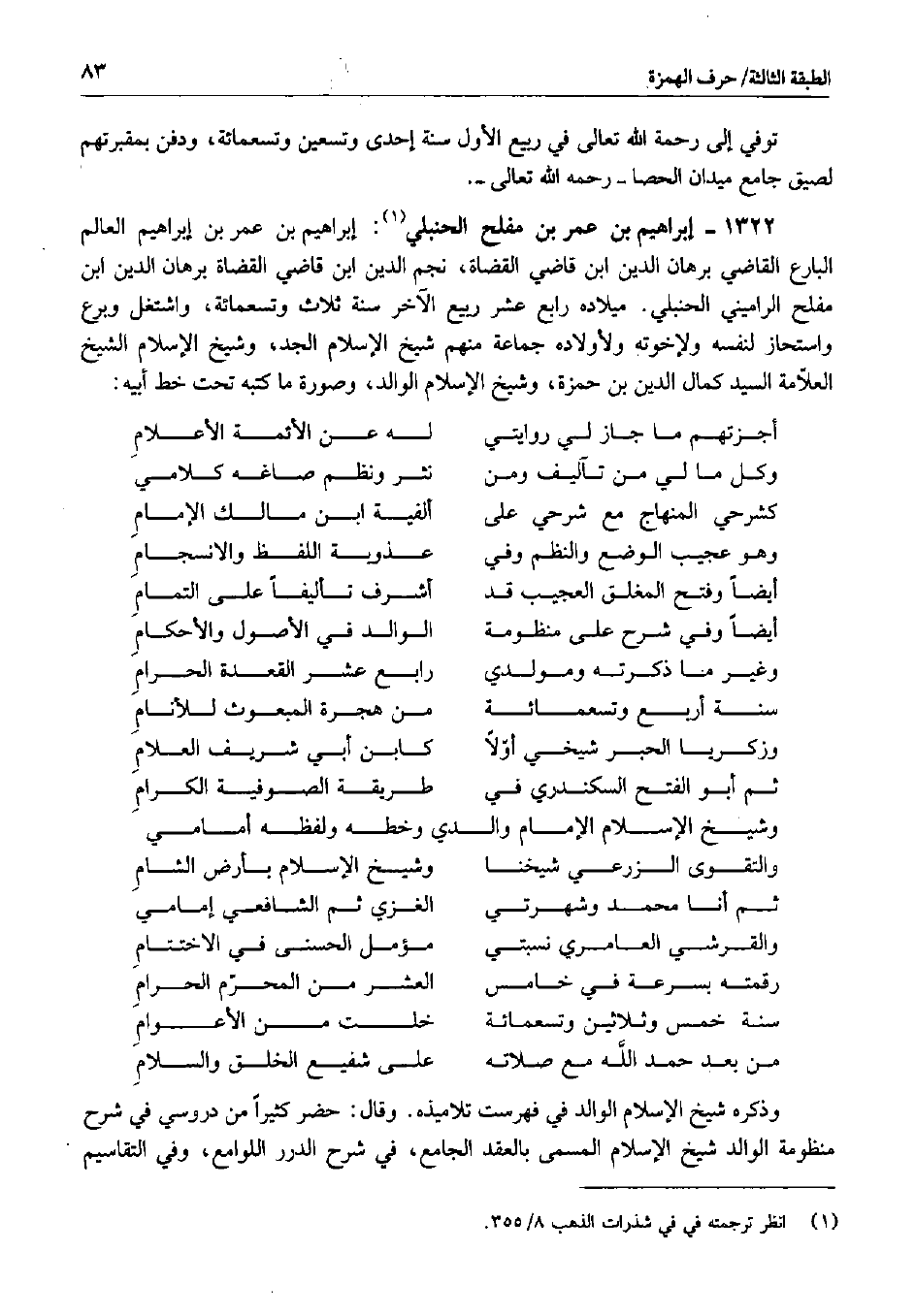 إبراهيم بن عمر بن إبراهيم العالم البارع القاضي برهان الدين ابن قاضي القضاة، نجم الدين ابن قاضي القضاة برهان الدين ابن مفلح الراميني الحنبلي. ميلاده رابع عشر ربيع الآخر سنة ثلاث وتسعمائة، واشتغل وبرع واستحاز لنفسه ولإخوته ولأولاده جماعة منهم شيخ الإسلام الجد، وشيخ الإسلام الشيخ العلامة السيد كمال الدين بن حمزة، وشيخ الإسلام الوالد، وصورة ما كتبه تحت خط أبيه: