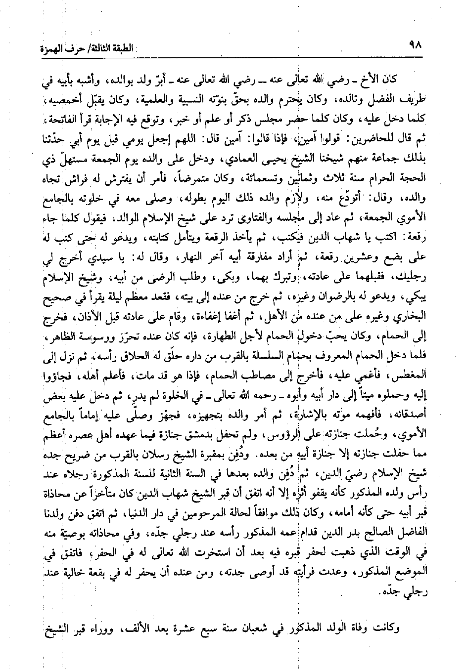 كان الأخ رضي الله تعالى عنه أبر ولد بوالده، وأشبه بأبيه في طريف الفضل وتالده، وكان يحترم والده بحق بنوته النسبية والعلمية، وكان يقبل أخمصيه، كلما دخل عليه، وكان كلما حضر مجلس ذكر أو علم أو خبر، وتوقع فيه الإجابة قرأ الفاتحة، ثم قال للحاضرين: قولوا آمين، فإذا قالوا: آمين قال: اللهم إجعل يومي قبل يوم أبي حدثنا بذلك جماعة منهم شيخنا الشيخ يحيى العمادي، ودخل على والده يوم الجمعة مستهل ذي الحجة الحرام سنة ثلاث وثمانين وتسعمائة، وكان متمرضاً، فأمر أن يفترش له فراش تجاه والده، وقال: أتودع منه، ولازم والده ذلك اليوم بطوله، وصلى معه في خلوته بالجامع الأموي الجمعة، ثم عاد إلى مجلسه والفتاوى ترد على شيخ الإسلام الوالد، فيقول كلما جاء رقعة: اكتب يا شهاب الدين فيكتب، ثم يأخذ الرقعة ويتأمل كتابته، ويدعو له حتى كتب له على بضع وعشرين رقعة، ثم أراد مفارقة أبيه آخر النهار، وقال له: يا سيدي أخرج لي رجليك، فقبلهما على عادته، وتبرك بهما، وبكى، وطلب الرضى من أبيه، وشيخ الإسلام يبكي، ويدعو له بالرضوان وغيره، ثم خرج من عنده إلى بيته، فقعد معظم ليلة يقرأ في صحيح بخاري وغيره على من عنده من الأهل، ثم أغفا إغفاءة، وقام على عادته قبل الأذان، فخرج إلى الحمام، وكان يحب دخول الحمام لأجل الطهارة، فإنه كان عنده تحرّز ووسوسة الظاهر، فلما دخل الحمام المعروف بحمام السلسلة بالقرب من داره حلّق له الحلاق رأسه، ثم نزل إلى المغطس، فأغمي عليه، فأخرج إلى مصاطب الحمام، فإذا هو قد مات، فأعلم أهله، فجاؤوا به وحملوه ميتاً إلى دار أبيه وأبوه رحمه الله تعالى في الخلوة لم يدر، ثم دخل عليه بعض أصدقائه، فأفهمه موته الإشارة، ثم أمر والده بتجهيزه، فجهز وصلى عليه إماماً بالجامع الأموي، وحملت جنازته على الرؤوس، ولم تحفل بدمشق جنازة فيما عهده أهل عصره أعظم مما حفلت جنازته إلا جنازة أبيه من بعده. ودفن بمقبرة الشيخ رسلان بالقرب من ضريح جده شيخ الإسلام رضي الدين، ثم دفن والده بعده في السنة الثانية للسنة المذكورة رجلاه عند رأس ولده المذكور كأنه يقفو أثره إلا أنه اتفق أن قبر الشيخ شهاب الدين كان متأخراً عن محاذاة قبر أبيه حتى كأنه أمامه، وكان ذلك موافقاً لحالة المرحومين في دار الدنيا، ثم اتفق دفن ولدنا الفاضل الصالح بدر الدين قدام عمه المذكور رأسه عند رجلي جده، وفي محاذاته بوصية منه في الوقت الذي ذهبت لحفر قبره فيه بعد أن استخرت الله تعالى له في الحفر، فاتفق في وضع المذكور، وعدت فرأيته قد أوصى جدته، ومن عنده أن يحفر له في بقعة خالية عند رجلي جده.