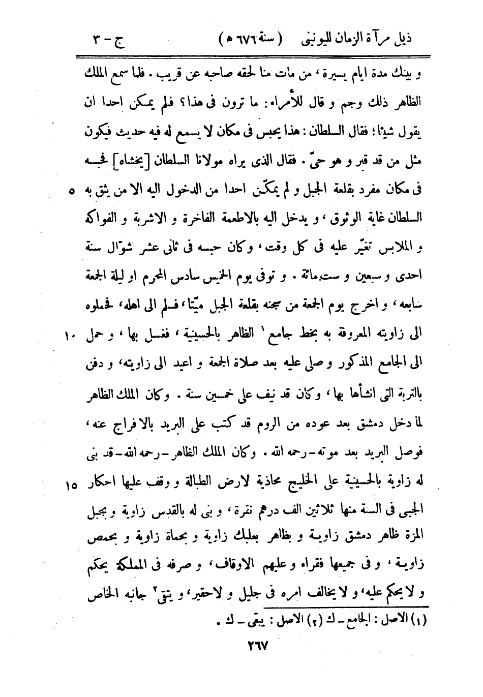 وبينك مدة أيام يسيرة، من مات منا لحقه صاحبه عن قريب. فلما سمع الملك الظاهر ذلك وجم وقال للأمراء: ما ترون في هذا؟ فلم يمكن أحداً ان يقول شيئاً؛ فقال السلطان: هذا يحبس في مكان لا يسمع له فيه حديث فيكون مثل من قد قبر وهو حي. فقال: الذي يراه مولانا السلطان - يخشاه - فحبسه في مكان مفرد بقلعة الجبل ولم يمكّن أحداً من الدخول إليه إلا من يثق به السلطان غاية الوثوق، ويدخل إليه بالأطعمة الفاخرة والأشربة والفواكه والملابس تغيّر عليه في كل وقت، وكان حبسه في ثاني عشر شوال سنة إحدى وسبعين وست مائة. وتوفي يوم الخميس سادس المحرم أو ليلة الجمعة سابعه، وأخرج يوم الجمعة من سجنه بقلعة الجبل ميتاً، فسلم إلى أهله، فحملوه إلى زاويته المعروفة به بخط جامع الظاهر بالحسينية، فغسل بها، وحمل إلى الجامع المذكور وصلي عليه بعد صلاة الجمعة وأعيد إلى زاويته، ودفن بالتربة التي أنشأها بها، وكان قد نيف على خمسين سنة. وكان الملك الظاهر لما دخل دمشق بعد عوده من الروم قد كتب على البريد بالإفراج عنه، فوصل البريد بعد موته رحمه الله. وكان الملك الظاهر رحمه الله قد بنى له زاوية بالحسينية على الخليج محاذية لأرض الطبالة ووقف عليها أحكار الجبي في السنة منها ثلاثين ألف درهم نقرة، وبني له بالمقدس زاوية وبجبل المزة ظاهر دمشق زاوية وبظاهر بعلبك زاوية وبحماة زاوية وبحمص زاوية، وفي جميعها فقراء وعليهم الأوقاف، وصرفه في المملكة يحكم ولا يحكم عليه، ولا يخالف أمره في جليل ولا حقير، ويتقي جانبه الخاص