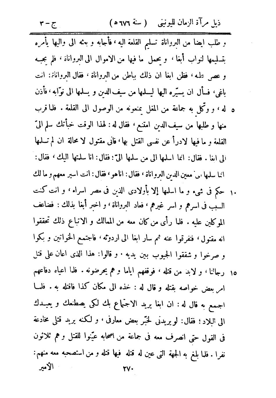 وطلب أيضاً من البرواناة تسليم القلعة إليه، فأجابه وبعثه إلى واليها بأمره بتسليمها لنواب أبغا، ويحمل ما فيها من الأموال إلى البرواناة، فلم يجبه وعصى عليه، فظن أبغا أن ذلك بباطن من البرواناة، فقال البرواناة: أنت باغي، فسأل أن يسيره إليها ليسلمها من سيف الدين ويسلمها إلى نوابه، فأذن له، ووكلّ به جماعة من المغل يمنعونه من الوصول إلى القلعة. فلما قرب منها وطلبها من سيف الدين امتنع، فقال له: لهذا الوقت خبأتك سلم إلي القلعة وما فيها لأدرأ عن نفسي القتل بها، فإني مقتول لا محالة إن لم تسلمها إلى أبغا. فقال: إنما أسلمها إلى من سلمها إلي؛ فقال: أنا سلمتها إليك، فقال: إنما سلمها إلي معين الدين البرواناة، فقال: أنا هو، فقال: أنت أسير معهم وما لك حكم في شيء وما أسلمها إلا بأولادي الذين في مصر أسراء، وأنت كنت السبب في أسرهم وأسر غيرهم، فعاد البرواناة، وأخبر أبغا بذلك: فضاعف الموكلين عليه. فلما رأى من كان معه من الممالك والأتباع ذلك تحققوا أنه مقتول، فتفرقوا عنه ثم سار أبغا إلى أردوئه، فاجتمع الخواتين وبكوا وصرخوا وشققوا الجيوب بين يديه. وقالوا: هذا الذي أعان على قتل رجالنا، ولا بد من قتله، فوقفهم أياماً وهم يحرضونه. فلما أعياه دفاعهم أمر بعض خواصه بقتله وقال له: خذه إلى مكان كذا فاقتله به. فلما اجتمع به قال له: إن أبغا يريد الاجتماع بك لكي يصطنعك ويعيدك إلى البلاد؛ فقال: لو يريدني لخبّر بعض معارفي، ولكنه يريد قتلي مخادعة في القول حتى انصرف معه في جماعة من أصحابه عينوا للقتل وهم ثلاثون نفراً. فلما بلغ به الجهة التي عين له قتله فيها قتله ومن استصحبه معه منهم: