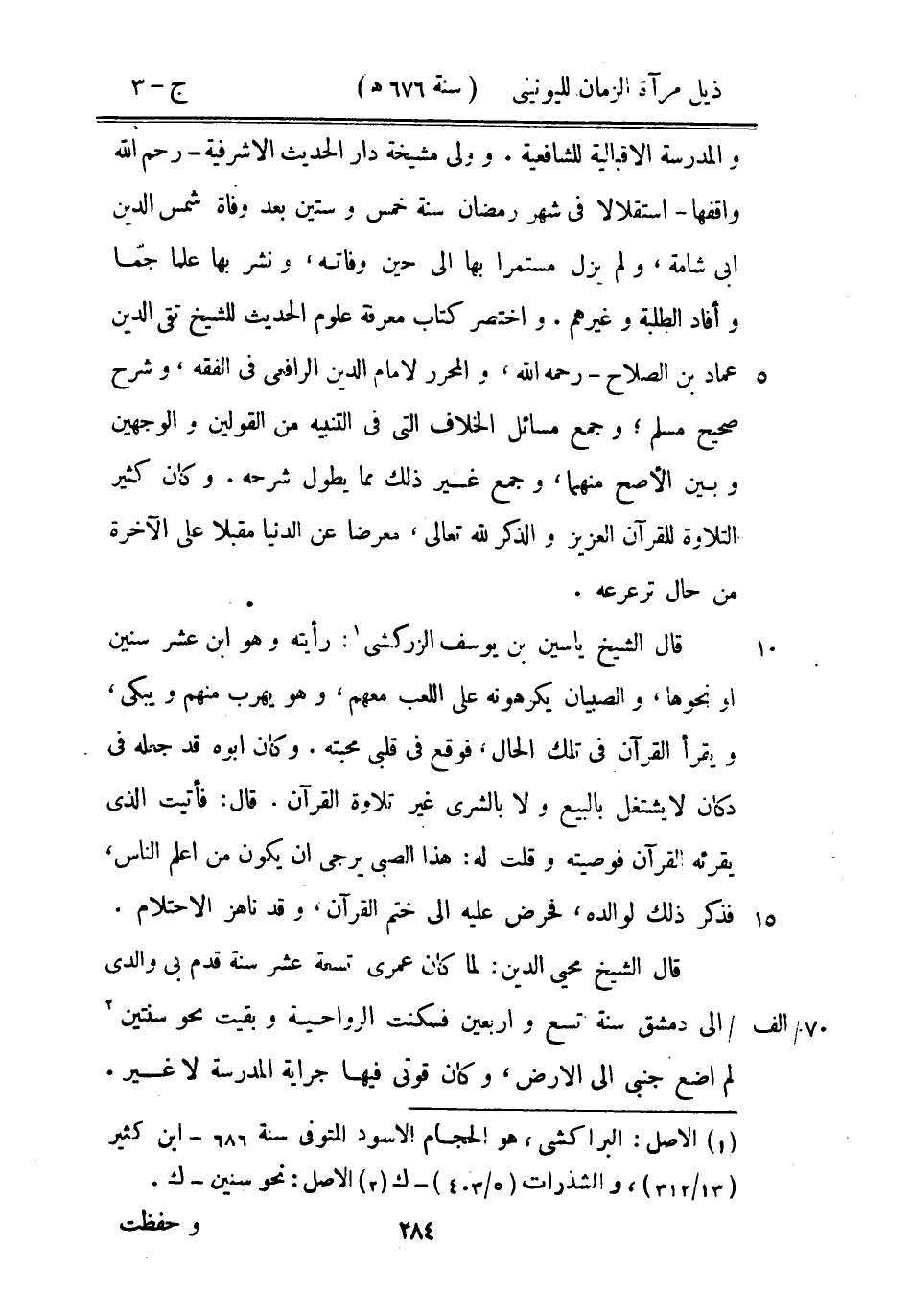 والمدرسة الإقبالية للشافعية. وولى مشيخة دار الحديث الأشرفية - رحم الله واقفها - اسقلالاً في شهر رمضان سنة خمس وستين بعد وفاة شمس الدين أبي شامة، ولم يزل مستمراً بها إلى حين وفاته، ونشر فيها علماً جماً وأفاد الطلبة وغيرهم. واختصر كتاب معرفة علوم الحديث للشيخ تقي الدين عماد بن الصلاح - رحمه الله، والمحرر لإمام الدين الرافعي في الفقه، وشرح صحيح مسلم؛ وجمع مسائل الخلاف التي في التنبيه من القولين والوجهين وبين الأصح منهما، وجمع غير ذلك مما يطول شرحه. وكان كثير التلاوة للقرآن العزيز والذكر لله تعالى، معرضاً عن الدنيا مقبلاً على الآخرة من حال ترعرعه.