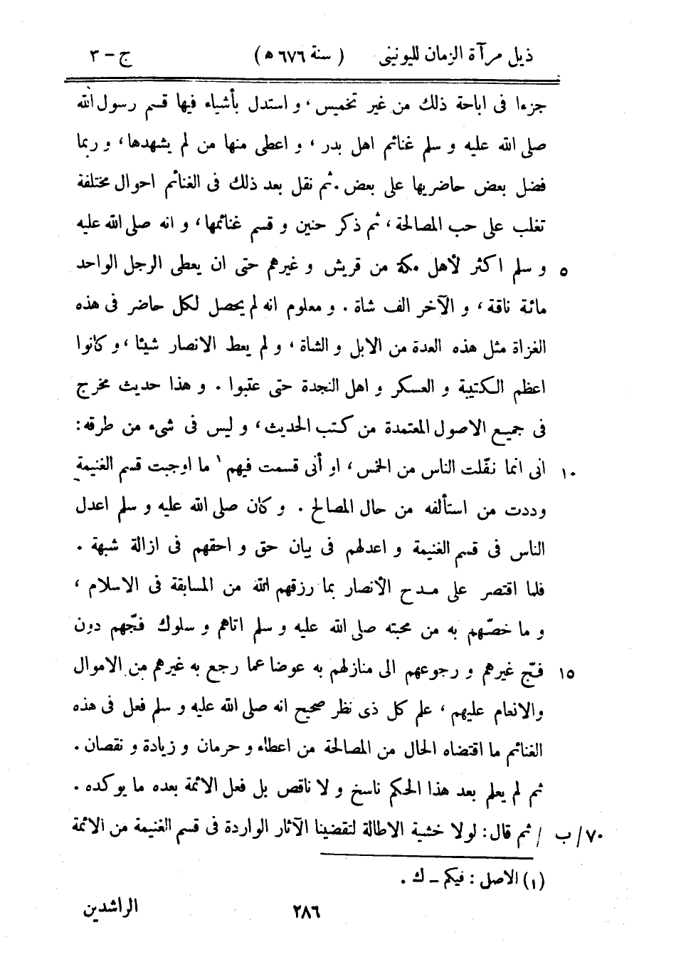 ثم نقل بعد ذلك في الغنائم أحوال مختلفة تغلب على حب المصالحة، ثم ذكر حنين وقسم غنائمها، وأنه صلى الله عليه وسلم أكثر لأهل مكة من قريش وغيرهم حتى أن يعطي الرجل الواحد مائة ناقة، والآخر ألف شاة. ومعلوم أنه لم يحصل لكل حاضر في هذه الغزاة مثل هذه العدة من الإبل والشاة، ولم يعط الأنصار شيئاً، وكانوا أعظم الكتيبة والعسكر وأهل النجدة حتى عتبوا. وهذا حديث مخرج في جميع الأصول المعتمدة من كتب الحديث، وليس في شيء من طرقه: إني إنما نفّلت الناس من الخمس، أو أني قسمت فيهم ما أوجبت قسم الغنيمة وددت من استألفه من حال المصالح. وكان صلى الله عليه وسلم أعدل الناس في قسم الغنيمة وأعدلهم في بيان حق وأحقهم في إزالة شبهة. فلما اقتصر على مدح الأنصار بما رزقهم الله من المسابقة في الإسلام، وما خصهم به من محبته صلى الله عليه وسلم أتاهم وسلوك فجّهم دون فج غيرهم ورجوعهم إلى منازلهم به عوضاً عما رجع به غيرهم من الأموال والأنعام عليهم، علم كل ذي نظر صحيح أنه صلى الله عليه وسلم فعل في هذه الغنائم ما اقتضاه الحال من المصالحة من إعطاء وحرمان وزيادة ونقصان. ثم لم يعلم بعد هذا الحكم ناسخ ولا ناقص بل فعل الأئمة بعده ما يوكده. ثم قال: لولا خشية الإطالة لتقضينا الآثار الواردة في قسم الغنيمة من الأئمة