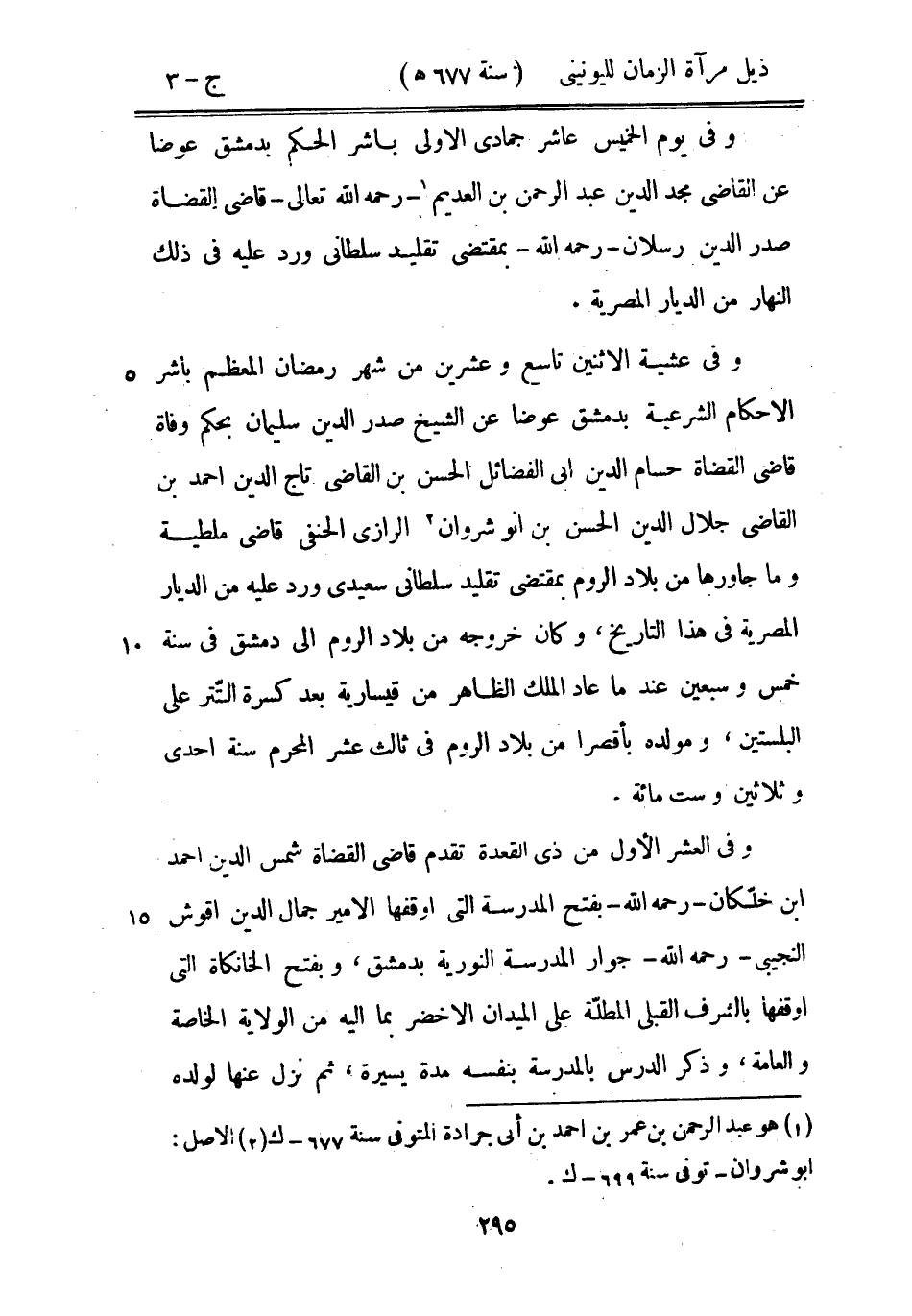 وفي يوم الخميس عاشر جمادى الأولى باشر الحكم بدمشق عوضاً عن القاضي مجد الدين عبد الرحمن بن العديم رحمه الله تعالى قاضي القضاة صدر الدين رسلان رحمه الله بمقتضى تقليد سلطاني ورد عليه في ذلك النهار من الديار المصرية.