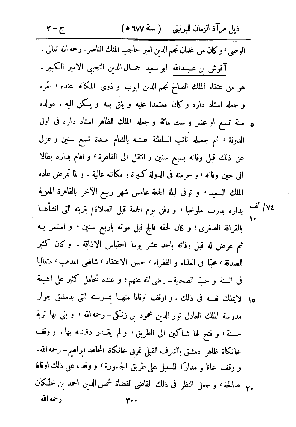 آقوش بن عبد الله أبو سعيد جمال الدين النجيبي الأمير الكبير. هو من عتقاء الملك الصالح نجم الدين أيوب وذوي المكانة عنده، أمّره وجعله أستاد داره وكان معتمداً عليه ويثق به ويسكن إليه. مولده سنة تسع أو عشر وست مائة وجعله الملك الظاهر أستاد داره في أول الدولة، ثم جعله نائب السلطنة عنه بالشام مدة تسع سنين وعزل عن ذلك قبل وفاته بسبع سنين وانتقل إلى القاهرة، وأقام بداره بطالاً إلى حين وفاته، وحرمته في الدولة كبيرة ومكانته عالية. ولما تمرض عاده الملك السعيد، وتوفي ليلة الجمعة خامس شهر ربيع الآخر بالقاهرة المعزية بداره بدرب ملوخيا، ودفن يوم الجمعة قبل الصلاة بتربته التي أنشأها بالقرافة الصغرى؛ وكان لحقه فالج قبل موته بأربع سنين، واستمر به ثم عرض له قبل وفاته بأحد عشر يوماً احتباس الاذاقة. وكان كثير الصدقة، محباً في العلماء والفقراء، حسن الاعتقاد، شافعي المذهب، متغالياً في السنة وحب الصحابة - رضي الله عنهم؛ وعنده تحامل كثير على الشيعة لا يملك نفسه في ذلك. وأوقف أوقافاَ منها بمدرسته التي بدمشق جوار مدرسة الملك العادل نور الدين محمود بن زنكي - رحمه الله. وبنى بها تربة حسنة، وفتح لها شباكين إلى الطريق، ولم يقدر دفنه بها. ووقف خانكاة ظاهر دمشق بالشرف القبلي غربي خانكاة المجاهد إبراهيم - رحمه الله. ووقف خانا ومداراً للسبيل على طريق الجسورة، ووقف على ذلك أوقافاً صالحة، وجعل النظر في ذلك لقاضي القضاة شمس الدين أحمد بن خلكان -