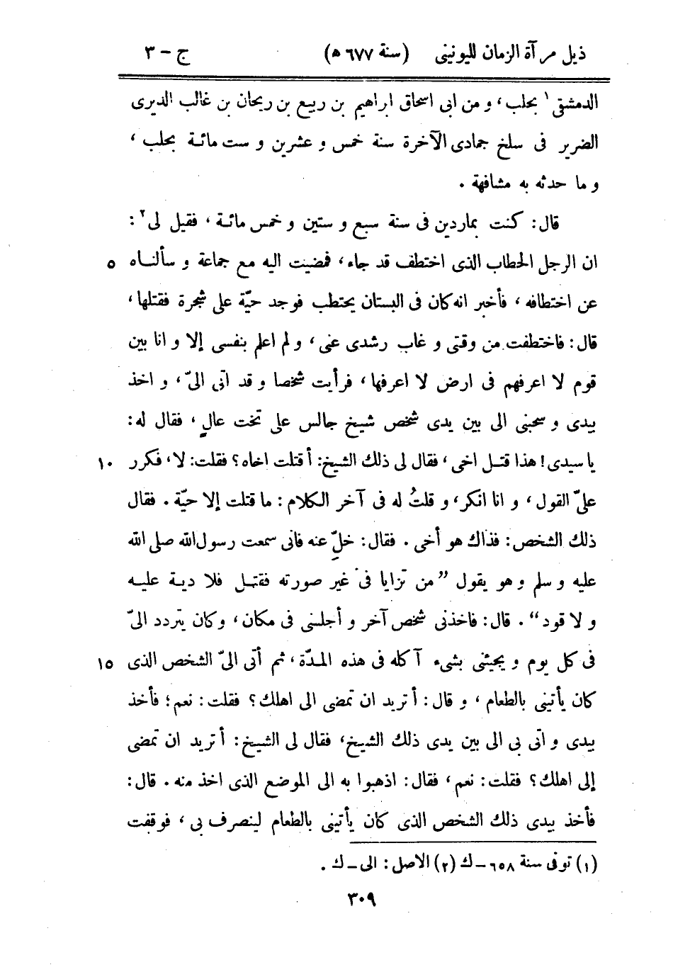 قال: كنت بماردين في سنة سبع وستين وخمس مائة. فقيل لي: ان الرجل الحطاب الذي اختطف قد جاء، فمضيت إليه مع جماعة وسألناه عن اختطافه، فأخبر أنه كان في البستان يحتطب فوجد حية على شجرة فقتلها، قال: فاختطفت من وقتي وغاب رشدي عني، ولم أعلم بنفسي إلا وأنا بين قوم لا أعرفهم في أرض لا أعرفها، فرأيت شخصاً وقد أتى إلي، وأخذ بيدي وسحبني إلى بين يدي شخص شيخ جالس على تخت عال، فقال له: يا سيدي! هذا قتل أخي، فقال لي ذلك الشيخ: أقتلت أخاه؟ فقلت: لا، فكرر عليّ القول، وأنا أنكر، وقلت له في آخر الكلام: ما قتلت إلا حية. فقال ذلك الشخص: فذاك هو أخي. فقال: خلّ عنه فإني سمعت رسول الله صلى الله عليه وسلم وهو يقول: " من تزايا في غير صورته فقتل فلا دية عليه ولا قود ". قال: فأخذني شخص آخر وأجلسني في مكان، وكان يتردد إليّ في كل يوم ويجيئني بشيء آكله في هذه المدة، ثم أتى إليّ الشخص الذي كان يأتيني بالطعام، وقال: أتريد أن تمضي إلى أهلك؟ فقلت: نعم؛ فأخذ بيدي وأتى بي إلى بين يدي ذلك الشيخ، فقال لي الشيخ: أتريد أن تمضي إلى أهلك؟ فقلت: نعم، فقال: اذهبوا به إلى الموضع الذي أخذ منه. قال: فأخذ بيدي ذلك الشخص الذي كان يأتيني بالطعام لينصرف بي، فوقفت