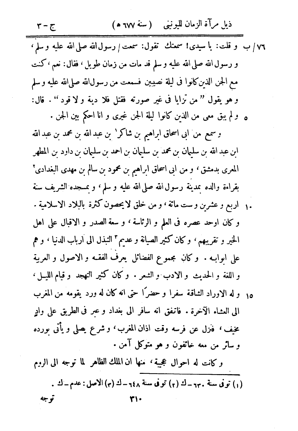 وقلت: يا سيدي! سمعتك تقول: سمعت رسول الله صلى الله عليه وسلم، ورسول الله صلى الله عليه وسلم قد مات من زمان طويل، فقال: نعم، كنت مع الجن الذين كانوا في ليلة نصيبين فسمعت من رسول الله صلى الله عليه وسلم وهو يقول: " من تزايا في غير صورته فقتل فلا دية ولا قود ". قال: ولم يبق معي من الذين كانوا ليلة الجن غيري وأنا أحكم بين الجن.