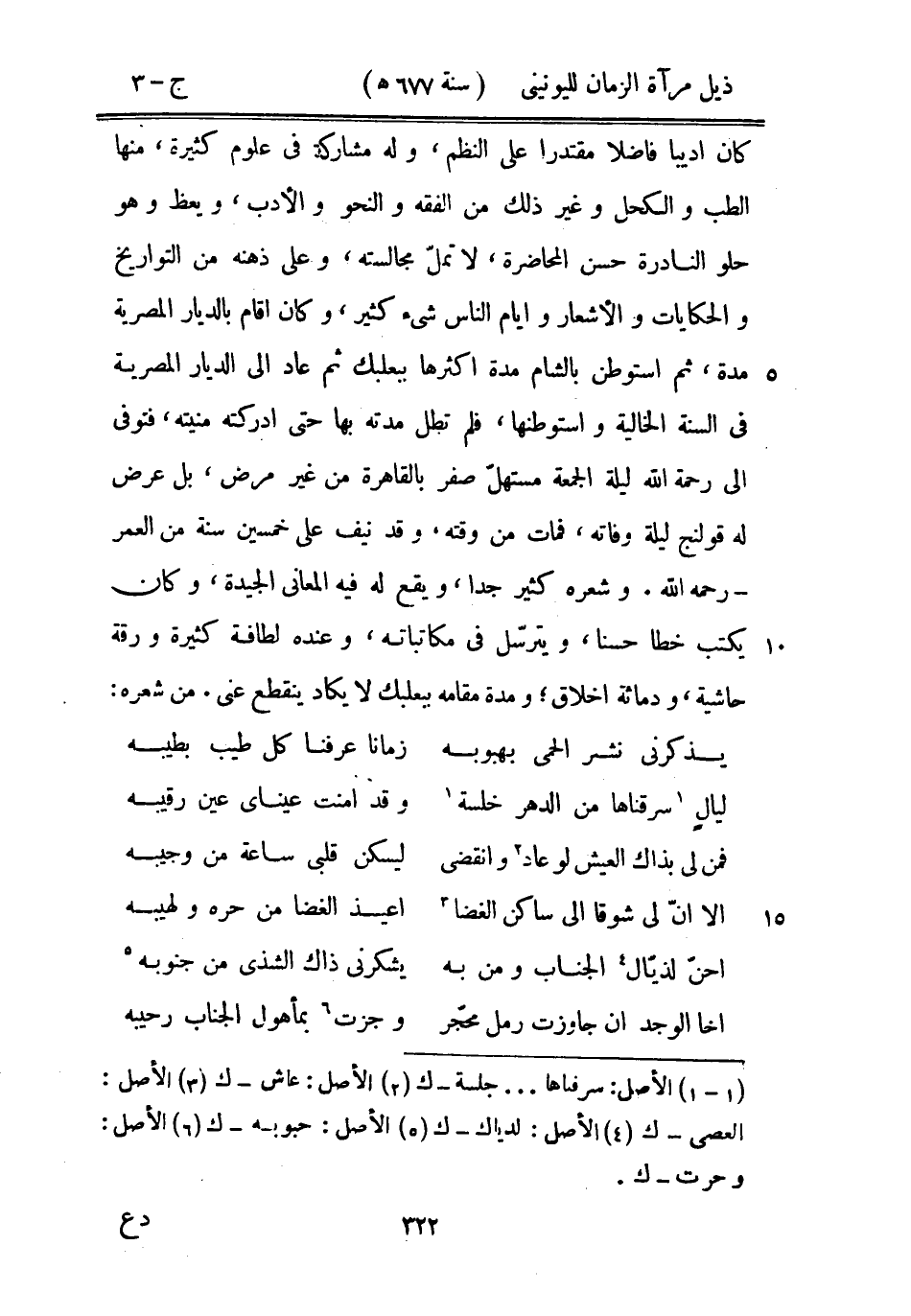 كان اديباً فاضلاً مقتدراً على النظم، وله مشاركة في علوم كثيرة، منها الطب والكحل وغير ذلك من الفقه والنحو والأدب، ويعظ وهو حلو النادرة حسن المحاضرة، لا تملّ مجالسته، وعلى ذهنه من التواريخ والحكايات والأشعار وأيام الناس شيء كثير، وكان أقام بالديار المصرية مدة، ثم استوطن بالشام مدة أكثرها ببعلبك ثم عاد إلى الديار المصرية في السنة الخالية واستوطنها، فلم تطل مدته بها حتى ادركته منيته، فتوفي إلى رحمة الله ليلة الجمعة مستهلّ صفر بالقاهرة من غير مرض، بل عرض له قولنج ليلة وفاته، فمات من وقته، وقد نيف على خمسين سنة من العمر - رحمه الله. وشعره كثير جداً، ويقع له فيه المعاني الجيدة، وكان يكتب خطاً حسناً، ويترِسّل في مكاتباته، وعنده لطافة كثيرة ورقة حاشية، ودماثة إخلاق، ومدة مقامه ببعلبك لا يكاد ينقطع عني. من شعره: