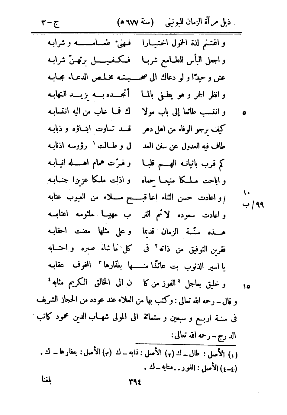 وقال رحمه الله تعالى: وكتب بها من العلاء عند عوده من الحجاز الشريف في سنة أربع وسبعين وستمائة إلى المولى شهاب الدين محمود كاتب الدرج رحمه الله تعالى: